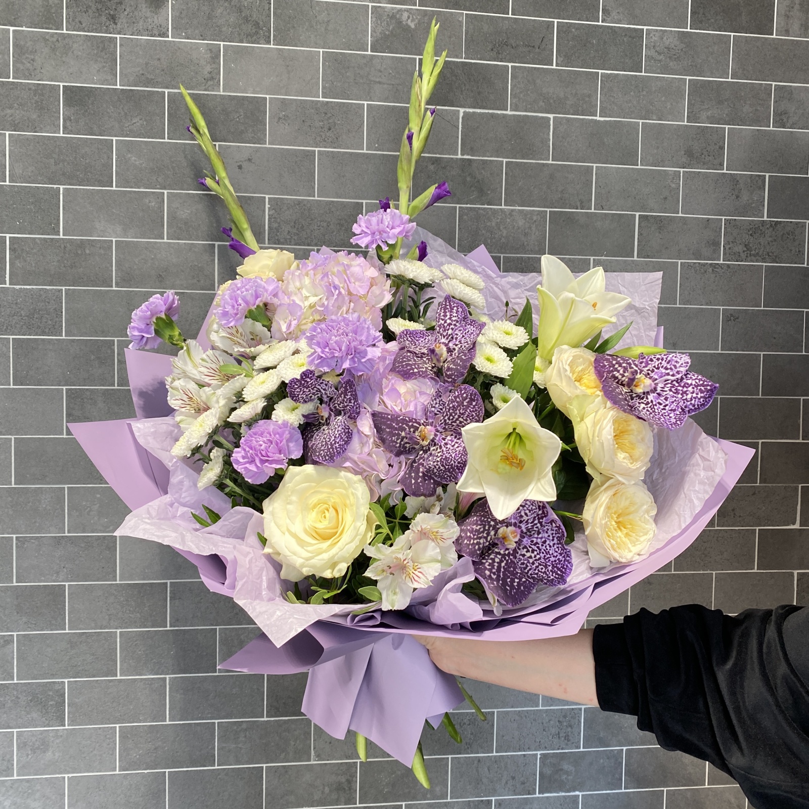 Состав: цветок ванды 6, гвоздика 5, хризантема кустовая 4, гортензия 2, гладиолус 2, роза кустовая 2, альстромерия 2, роза 1, лилия 1, фисташка 0,5 и прочее.