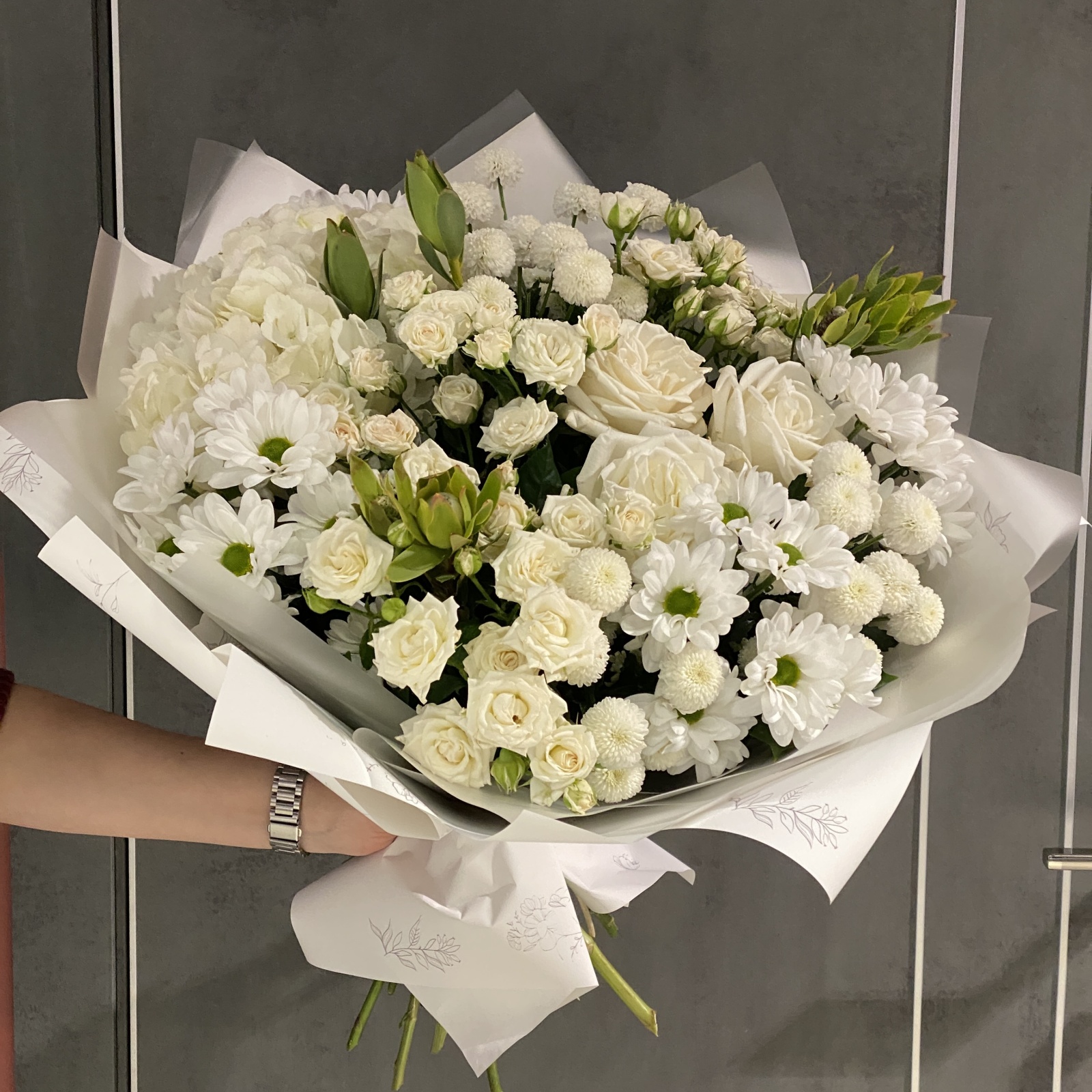 Состав: хризантема кустовая 6, роза 3, роза кустовая 3, леукадендрон 3, гортензия 1, рускус 1 и прочее. под заказ