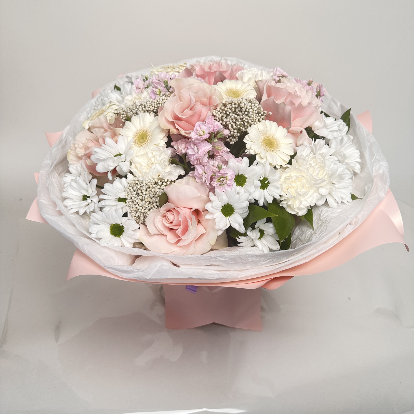 Состав: роза 7, гвоздика 6, хризантема кустовая 5, гербера 5, маттиола 3, рускус 1 и прочее.