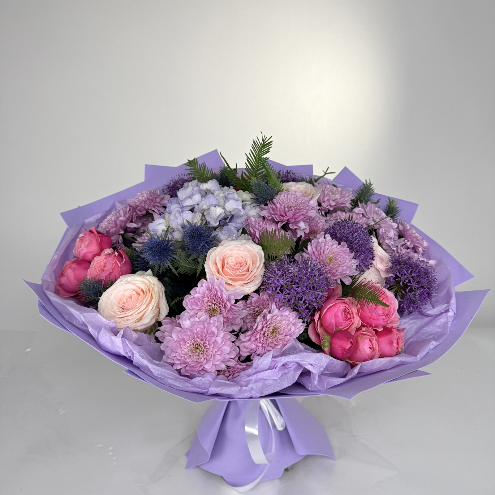 Состав: роза 5, хризантема кустовая 5, роза кустовая 3, эрингиум 3, гортензия 1, рускус 0,5 и прочее. в наличии