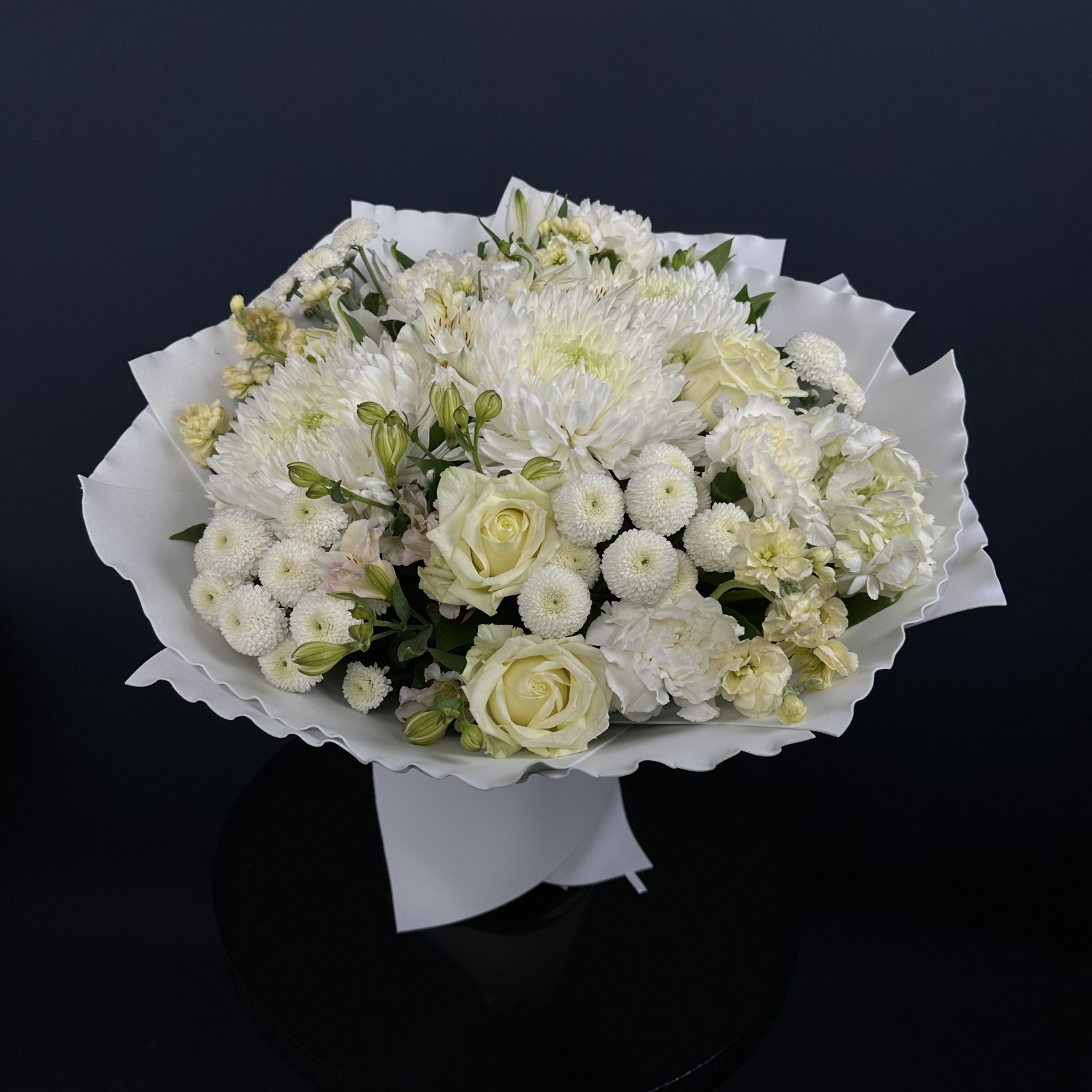 Состав: гвоздика 5, хризантема кустовая 4, альстромерия 4, маттиола 3, хризантема 3, роза 3, гортензия 1, рускус 0,6 и прочее. под заказ