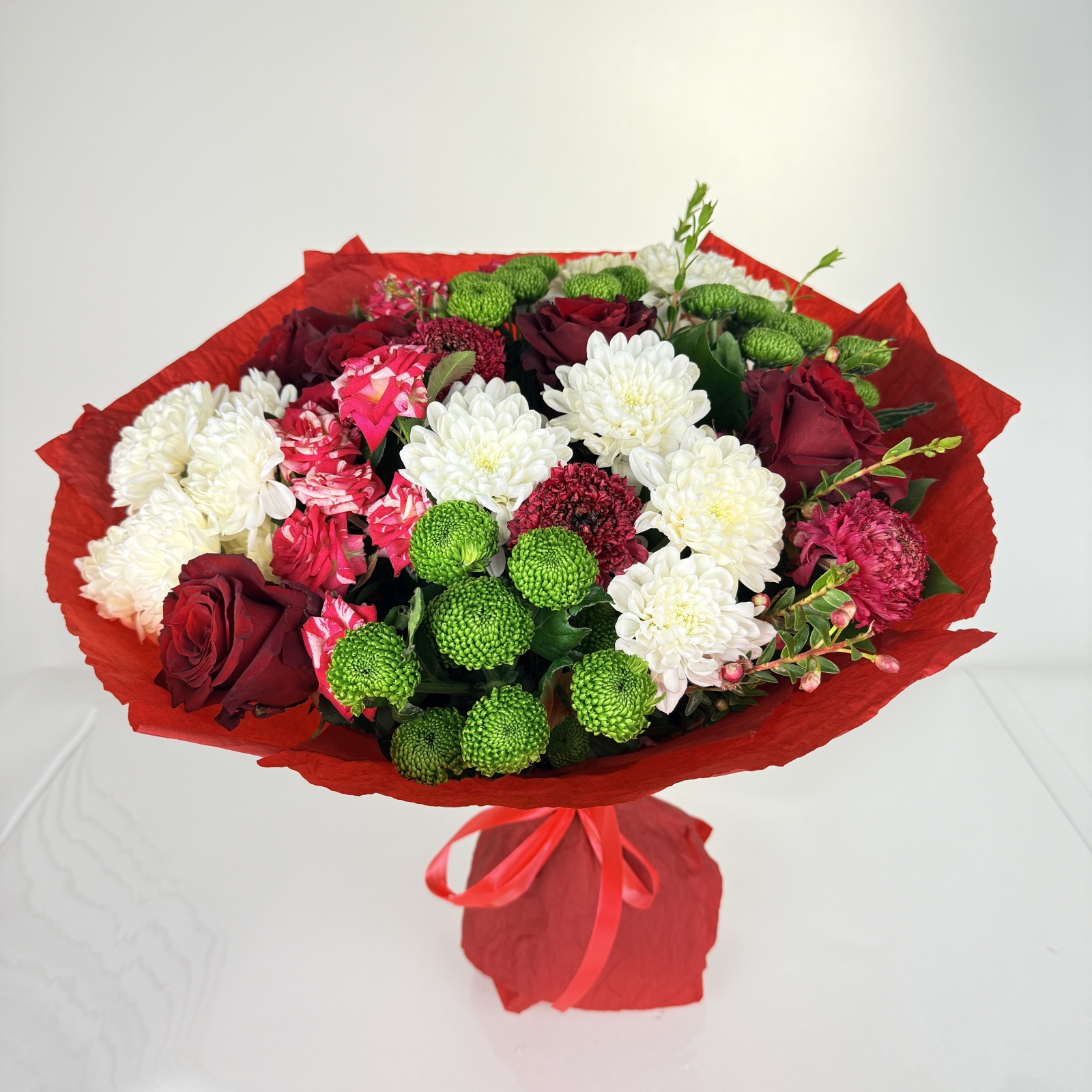 Состав: хризантема кустовая 5, роза 5, ранункулюс 3, роза кустовая 2 и прочее. в наличии