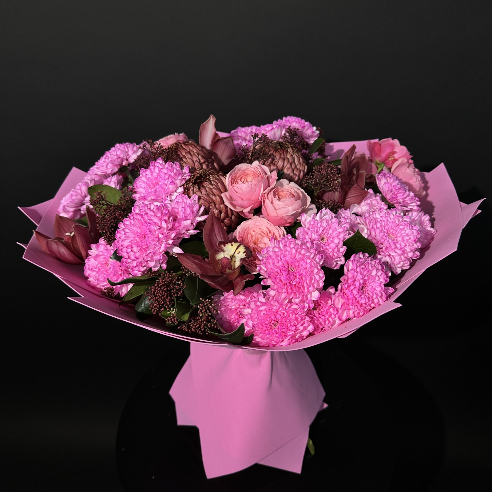 Состав: хризантема кустовая 5, хризантема 3, роза кустовая 3, роза 1, салал 0,5, ветка цимбидиум 0,3 и прочее. в наличии