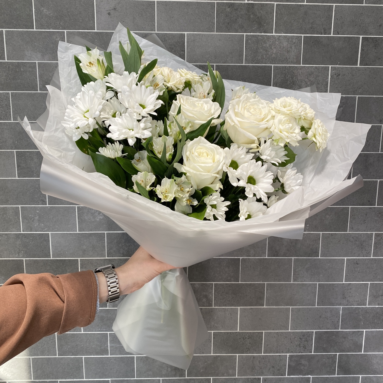Состав: роза 3, альстромерия 3, роза кустовая 2, хризантема кустовая 2, рускус 0,3 и прочее. под заказ