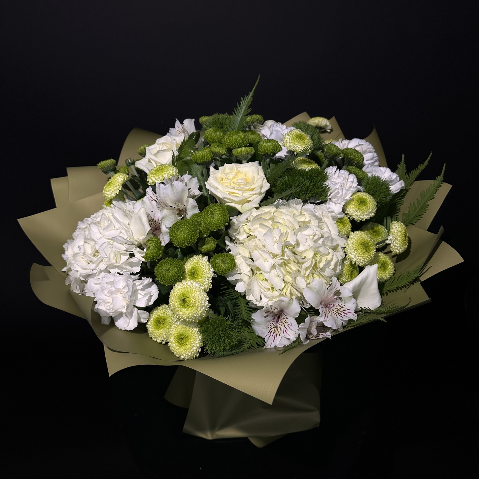 Состав: гвоздика 10, хризантема кустовая 10, роза 3, альстромерия 3, гортензия 2, рускус 1 и прочее.