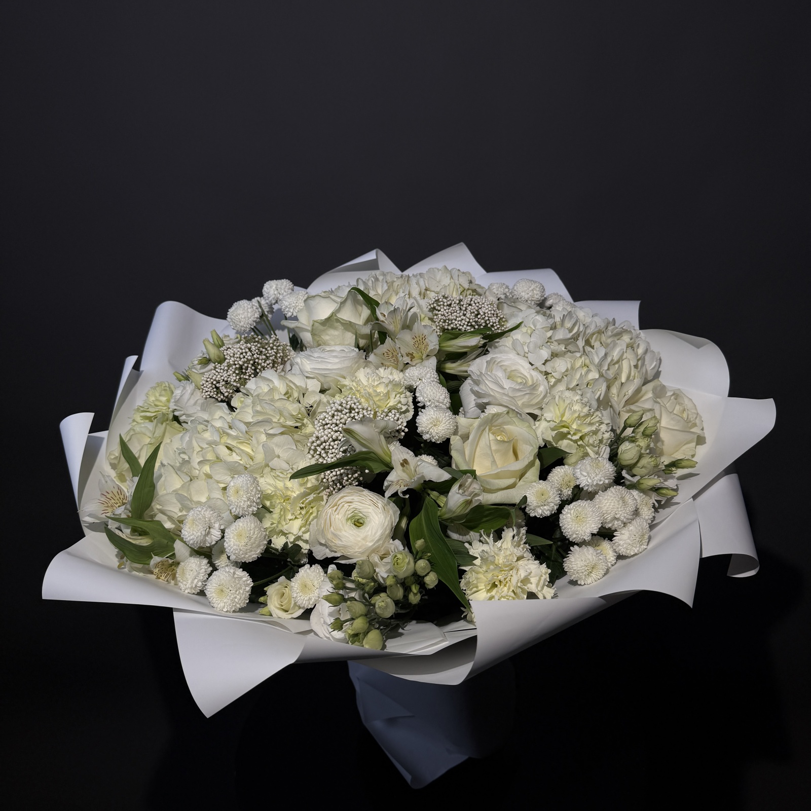 Состав: гвоздика 5, хризантема кустовая 5, роза 5, альстромерия 3, лизиантус 3, гортензия 3, лилия 1, рускус 0,5 и прочее. в наличии