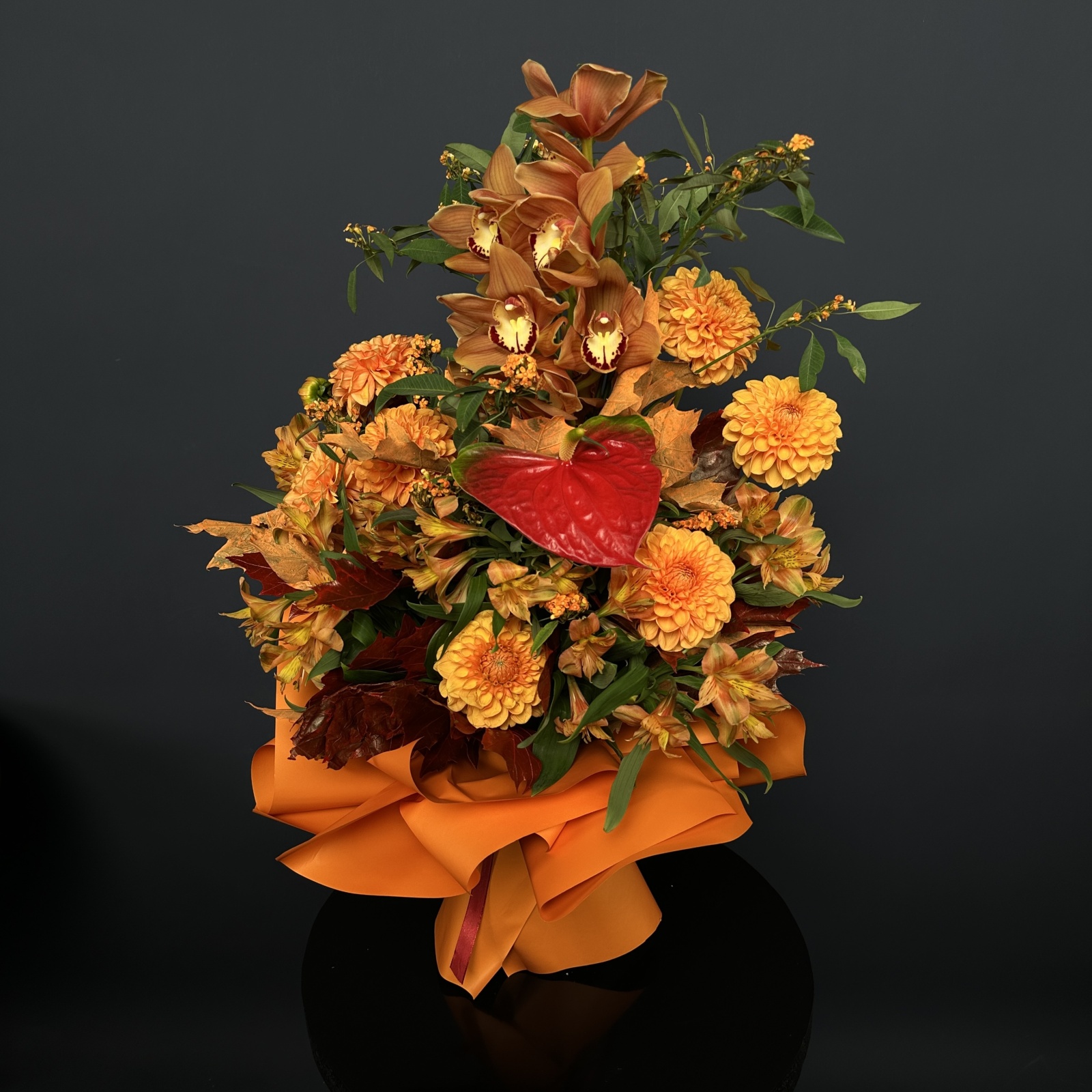 Состав: альстромерия 7, хризантема кустовая 4, ветка цимбидиум 0,5 и прочее. под заказ