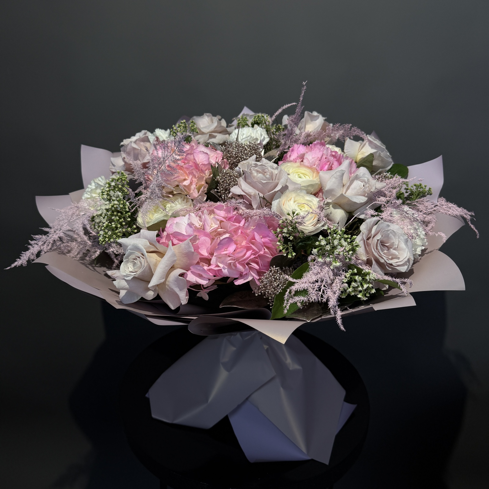 Состав: роза 9, гвоздика 5, гортензия 3, ранункулюс 3, салал 0,5 и прочее. в наличии