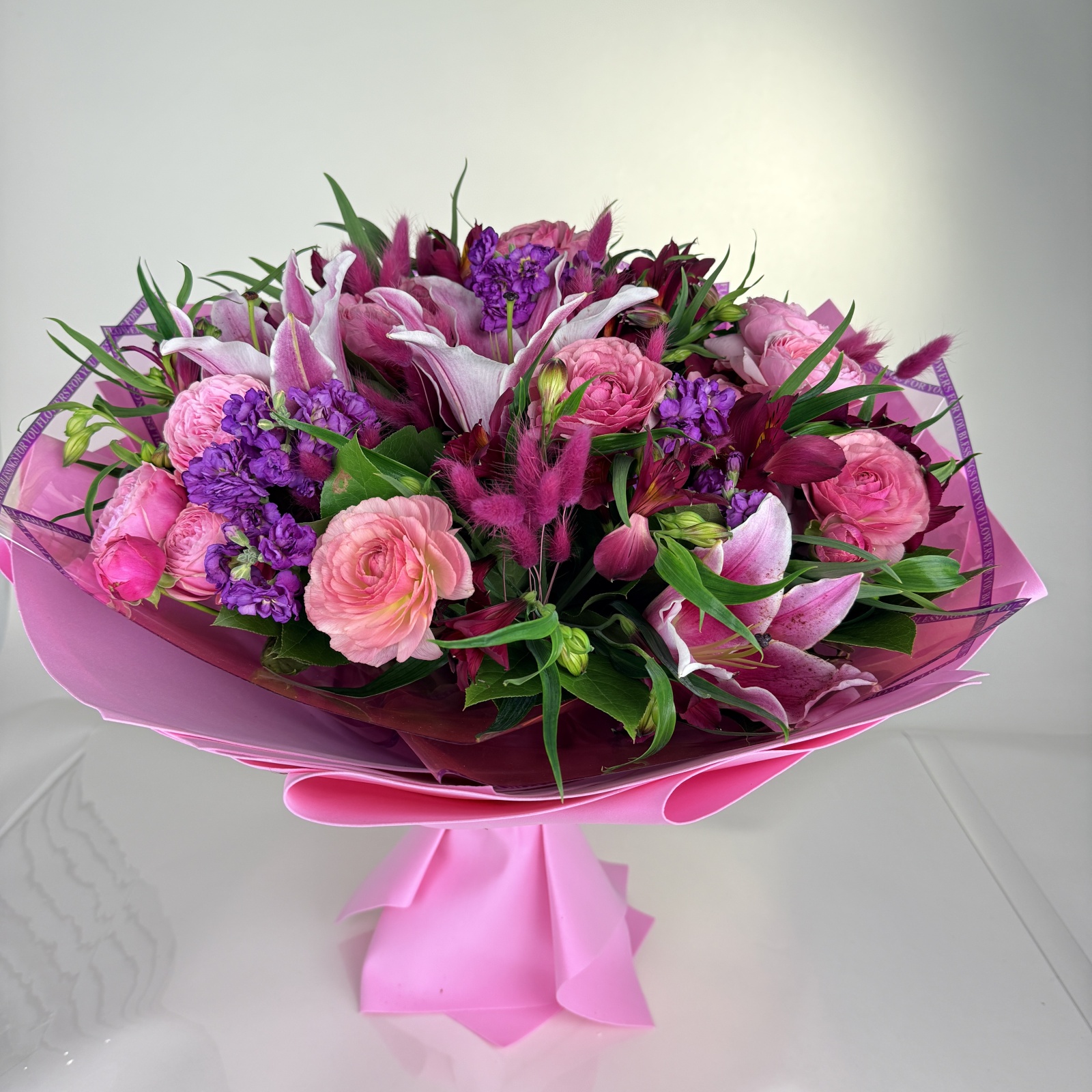 Состав: альстромерия 5, ранункулюс 5, роза кустовая 3, маттиола 3, лилия 2, салал 0,5 и прочее.
