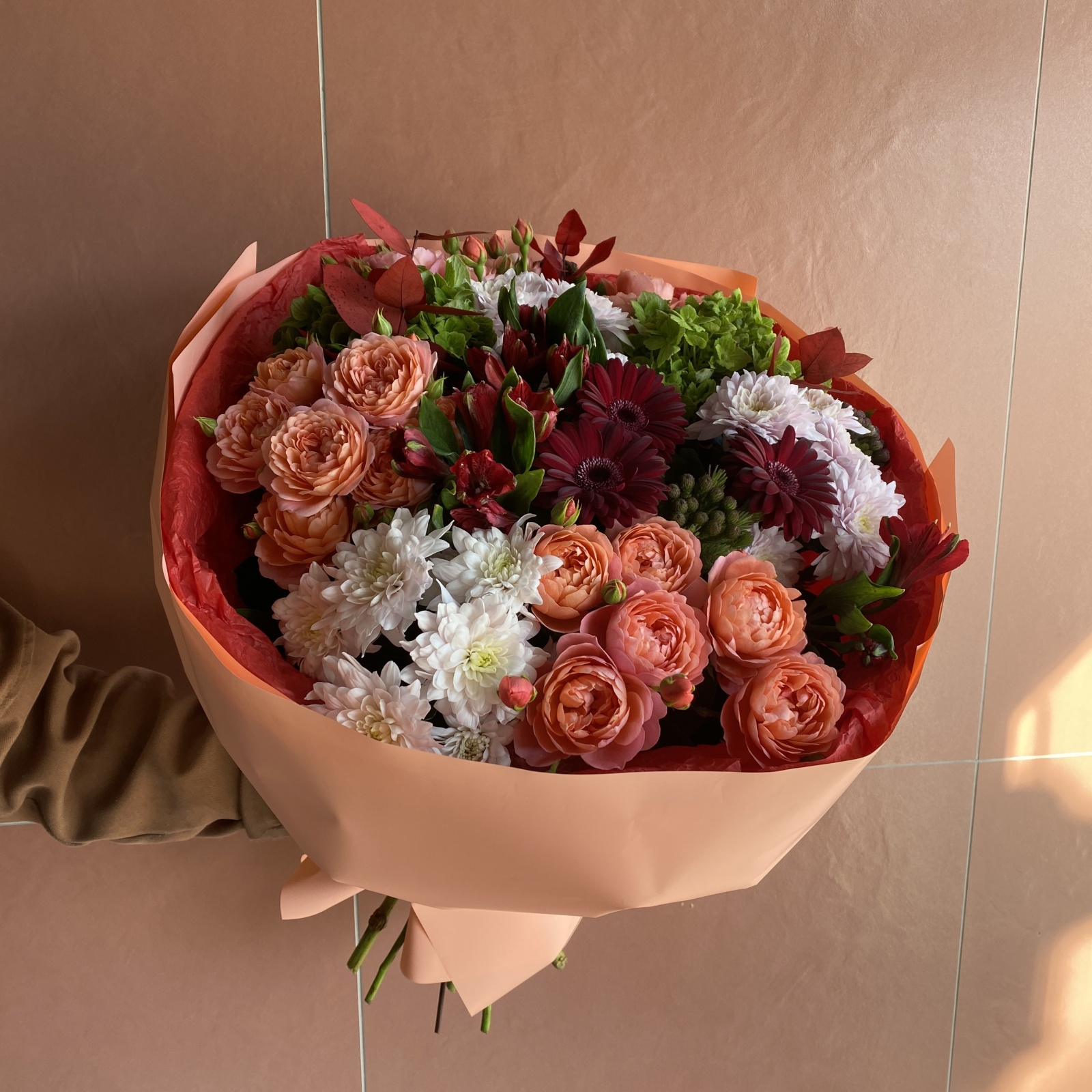 Состав: роза кустовая 4, хризантема кустовая 3, гербера 3, бруния 3, альстромерия 3, гортензия 2, рускус 0,7, эвкалипт 0,2 и прочее. под заказ