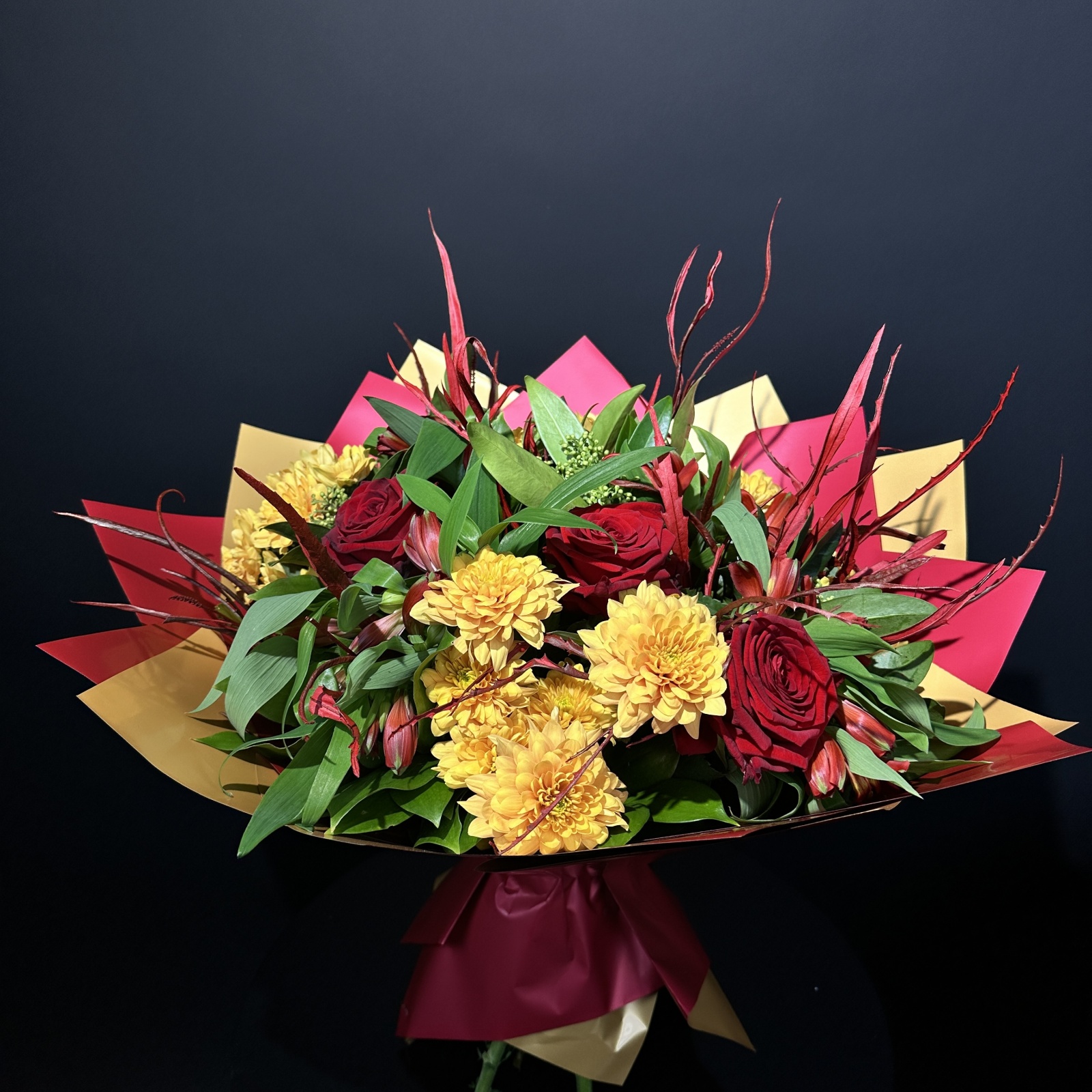 Состав: роза 5, хризантема кустовая 5, альстромерия 4, гвоздика 1, рускус 0,5 и прочее. в наличии