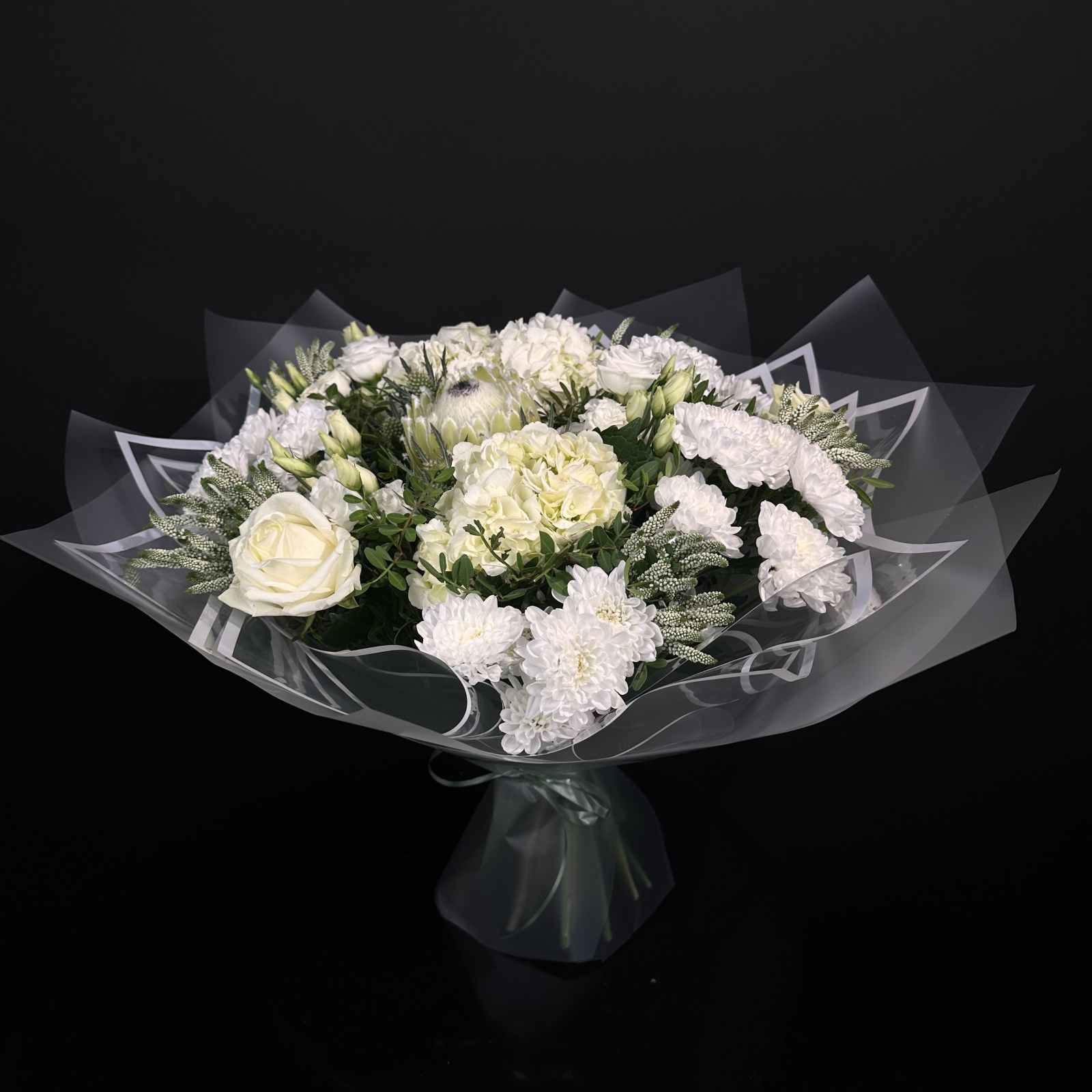 Состав: хризантема кустовая 4, лизиантус 3, роза 3, эрингиум 2, гортензия 2, фисташка 1 и прочее.