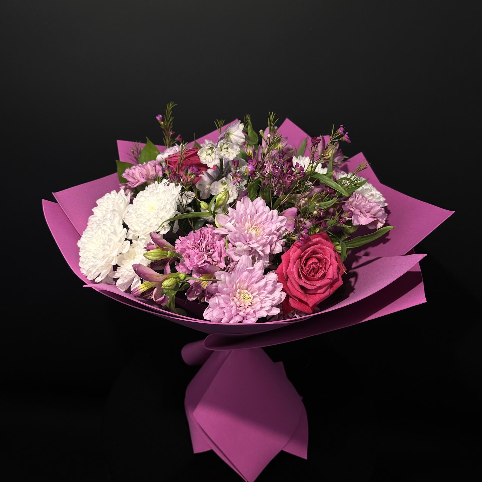 Состав: гвоздика 5, хризантема кустовая 5, роза 3, альстромерия 3, дельфиниум 2, хамелациум 1, рускус 0,5 и прочее. под заказ