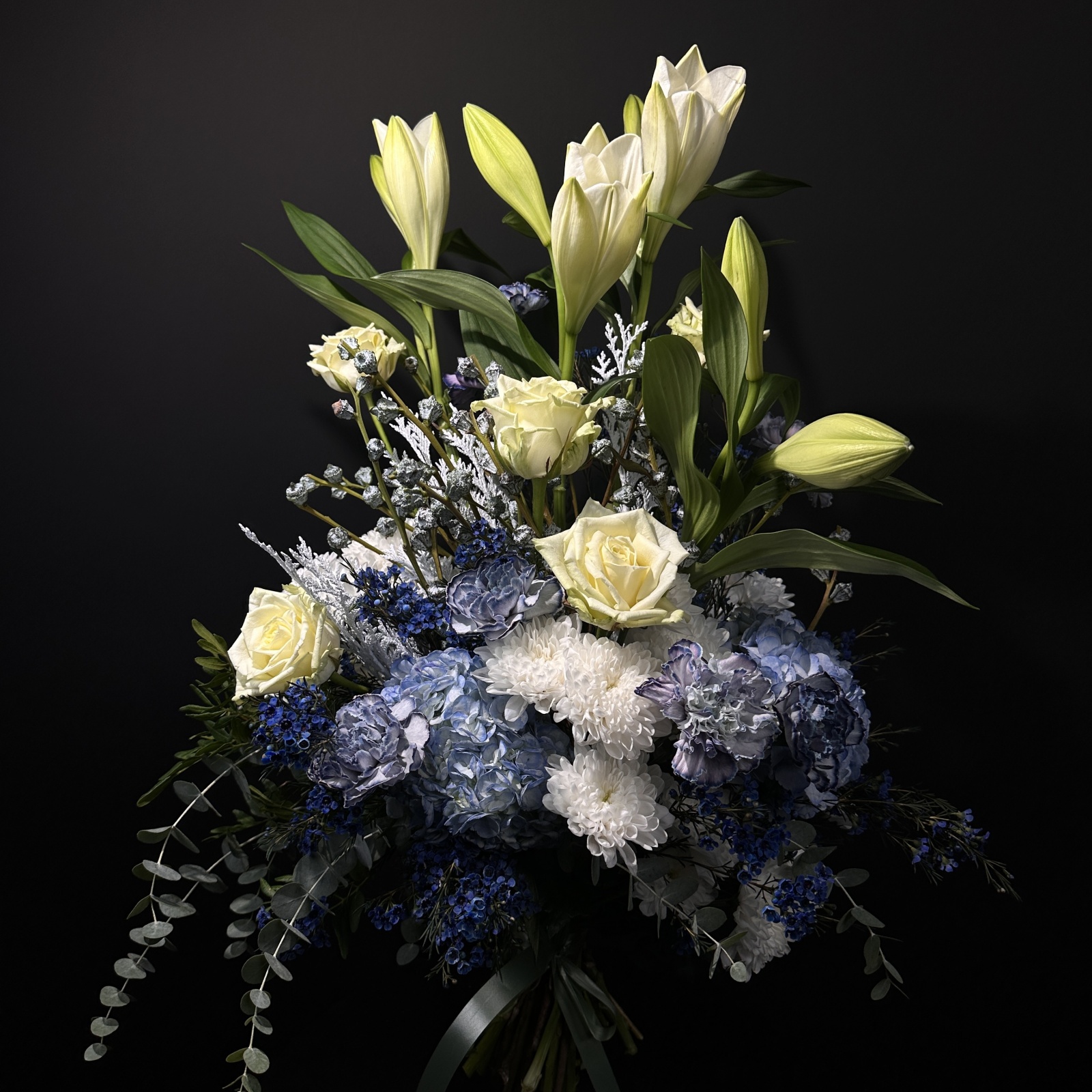 Состав: хризантема кустовая 7, гвоздика 7, роза 5, лилия 4, хамелациум 3, гортензия 2, эвкалипт 1 и прочее. в наличии