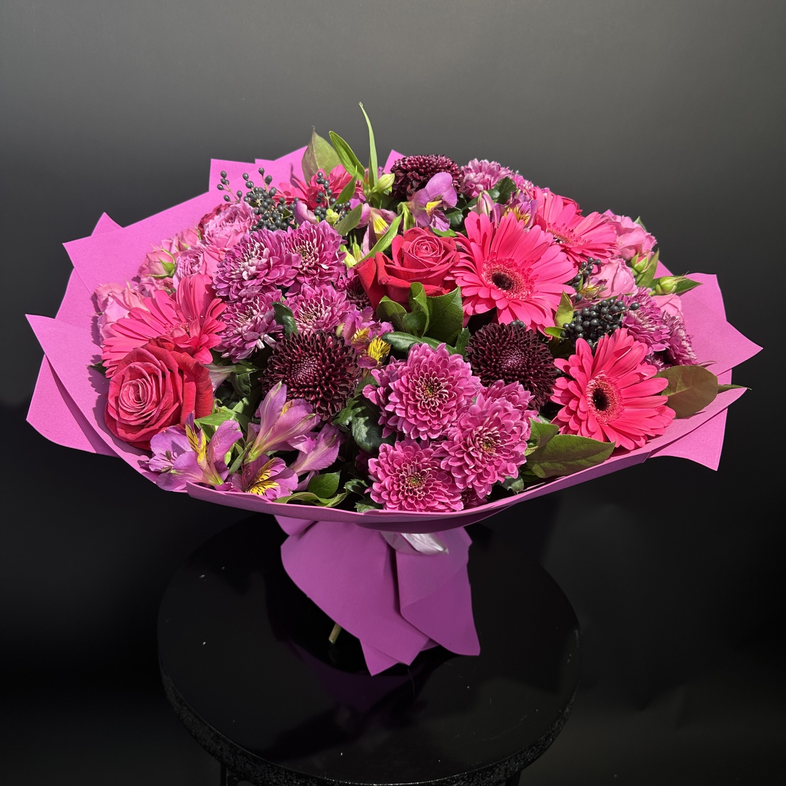 Состав: роза 5, гербера 5, альстромерия 4, хризантема кустовая 4, хризантема 3, роза кустовая 2, салал 0,5 и прочее.