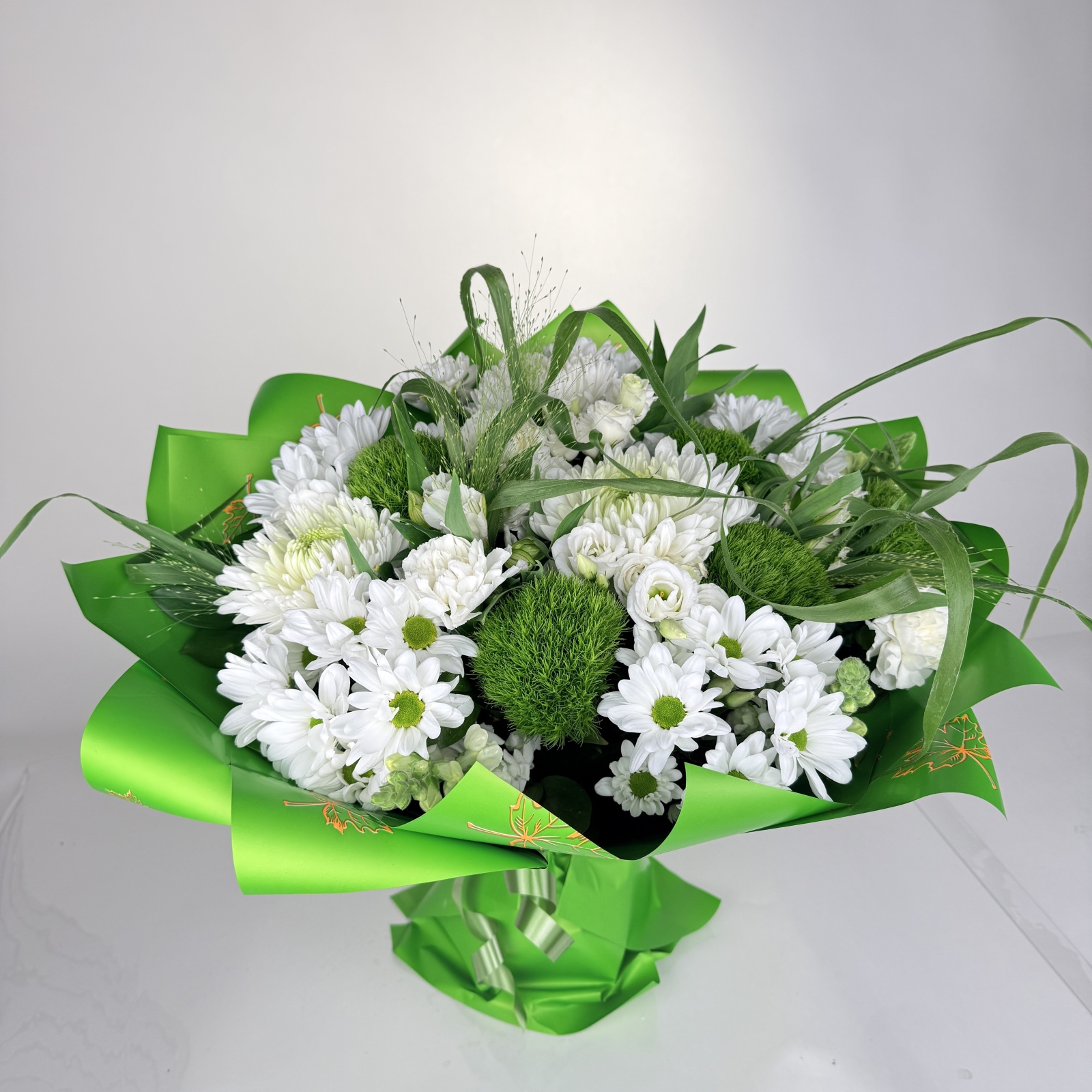 Состав: гвоздика 10, хризантема кустовая 5, антирринум 4, хризантема 3, лизиантус 3, роза 1, рускус 1 и прочее. в наличии