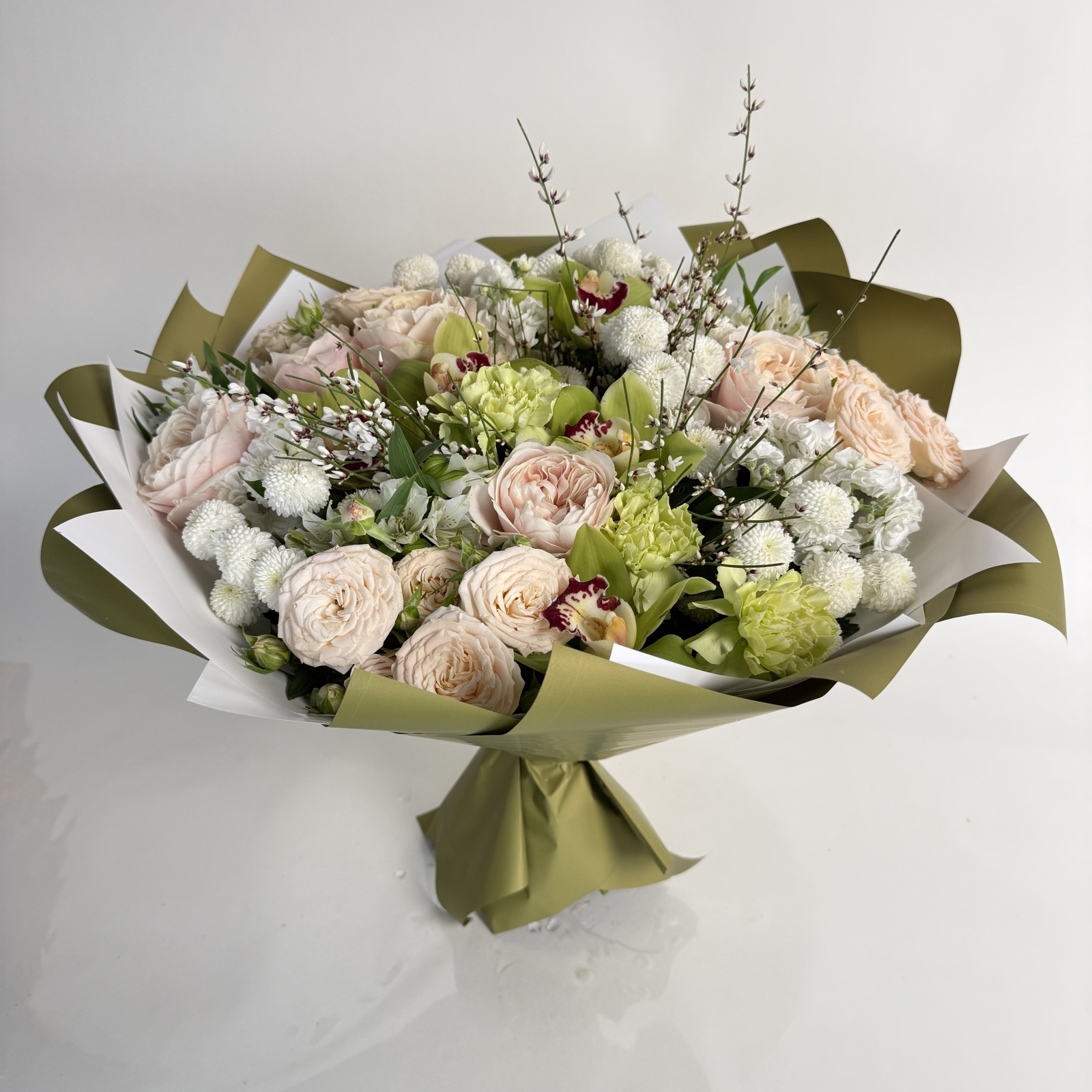 Состав: роза 5, гвоздика 5, хризантема кустовая 5, маттиола 3, роза кустовая 3, альстромерия 3, рускус 0,5, ветка цимбидиум 0,4 и прочее.