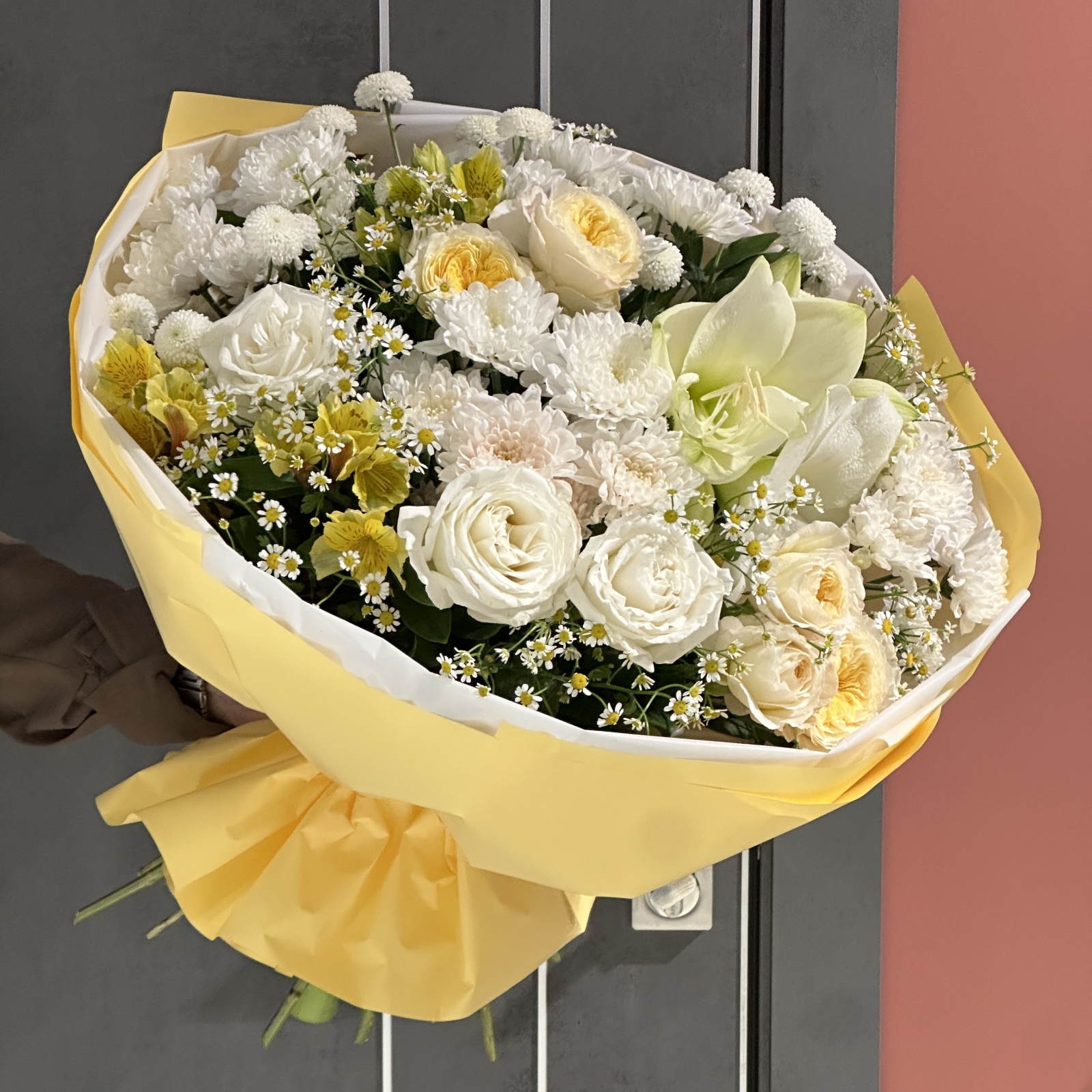 Состав: хризантема кустовая 7, роза 3, альстромерия 3, роза кустовая 2, рускус 0,5 и прочее.