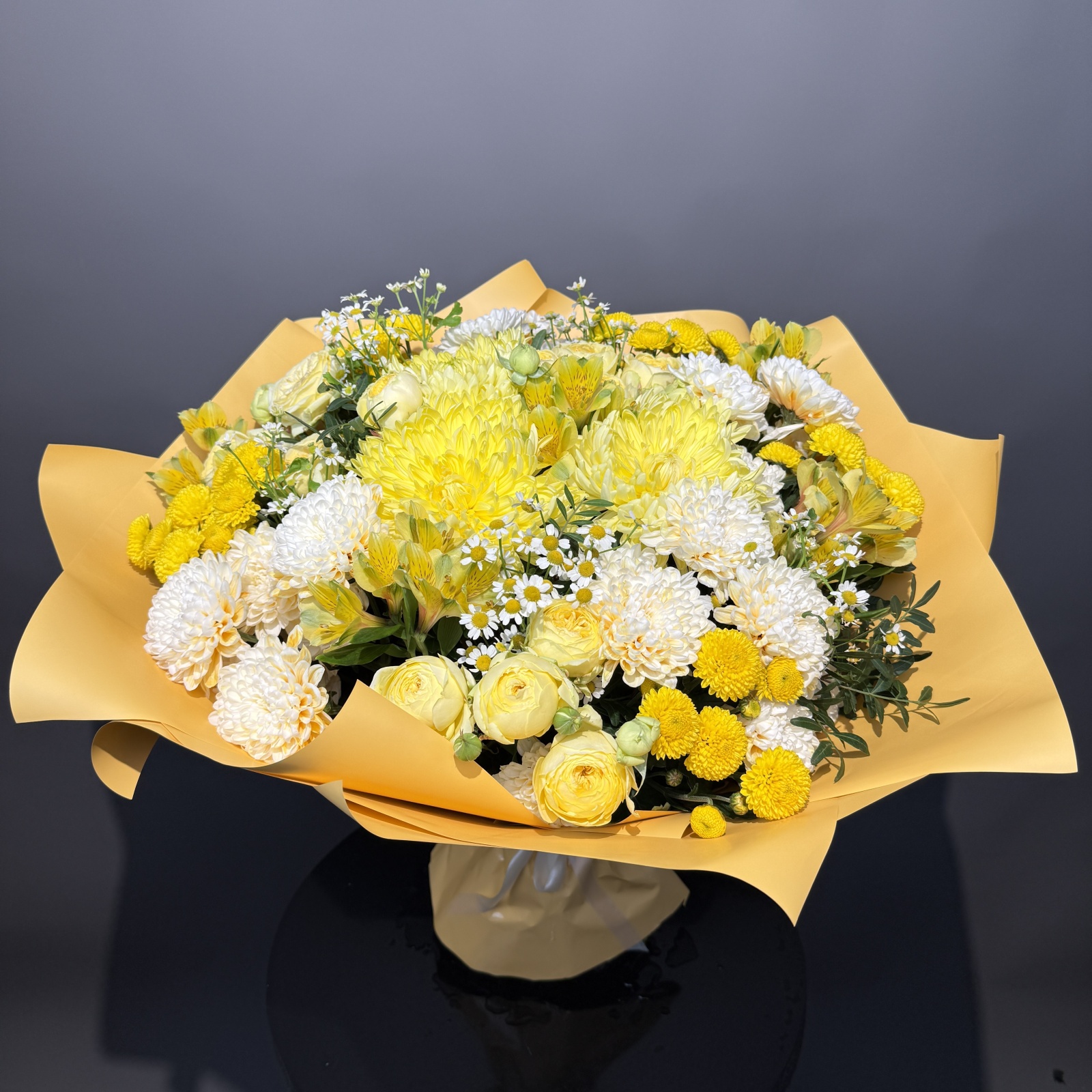 Состав: хризантема кустовая 9, альстромерия 5, роза кустовая 3, хризантема 3, фисташка 0,5 и прочее. в наличии