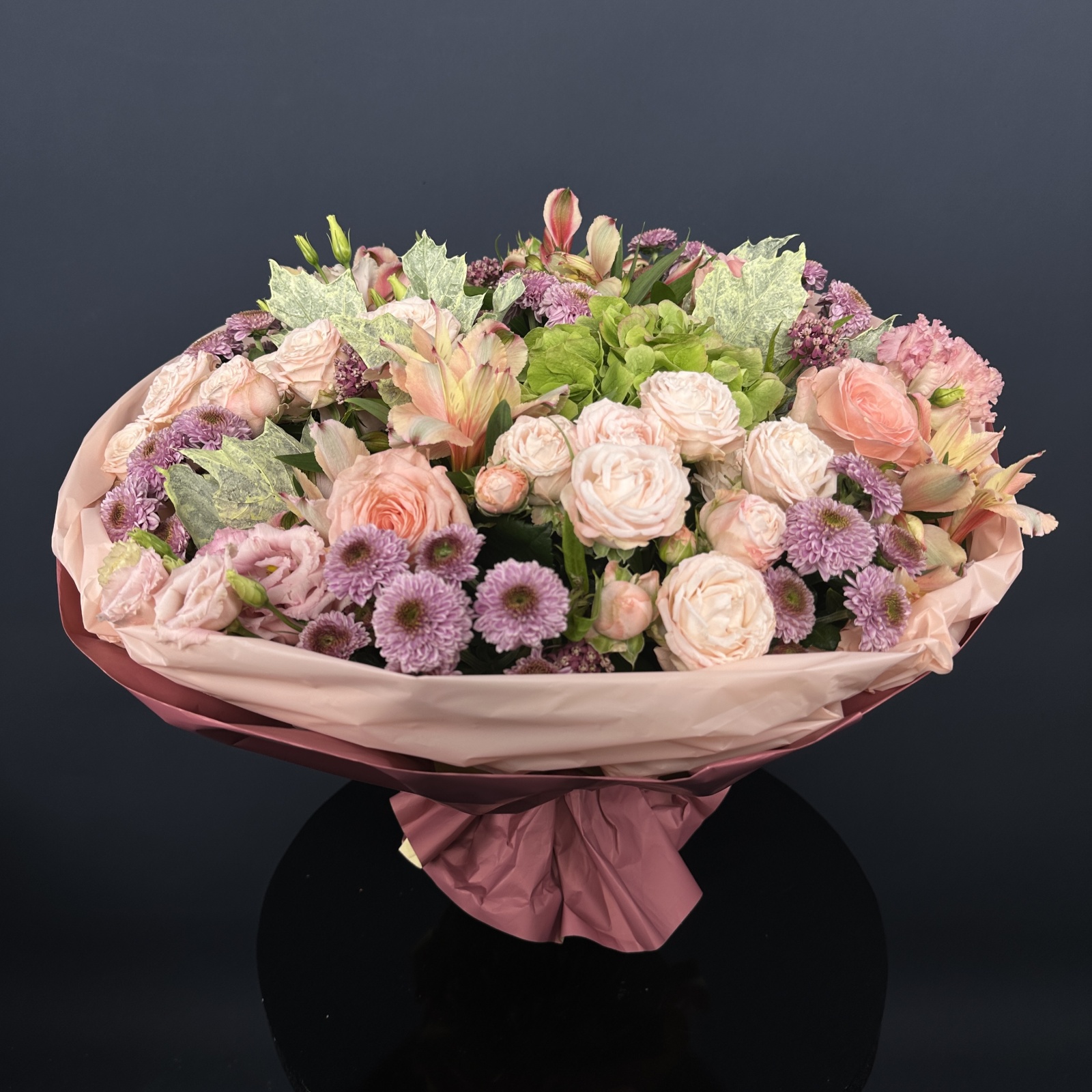 Состав: роза 5, альстромерия 4, роза кустовая 3, хризантема 3, лизиантус 3, хризантема кустовая 1, гортензия 1, рускус 0,5 и прочее. под заказ