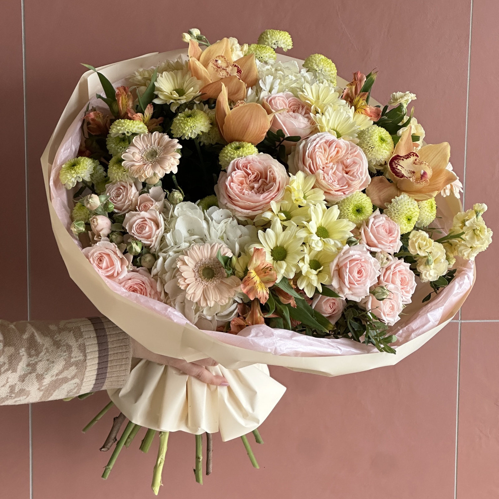 Состав: хризантема кустовая 7, гербера 3, роза 3, альстромерия 3, маттиола 3, роза кустовая 2, гортензия 2, фисташка 1, ветка цимбидиум 0,2 и прочее.