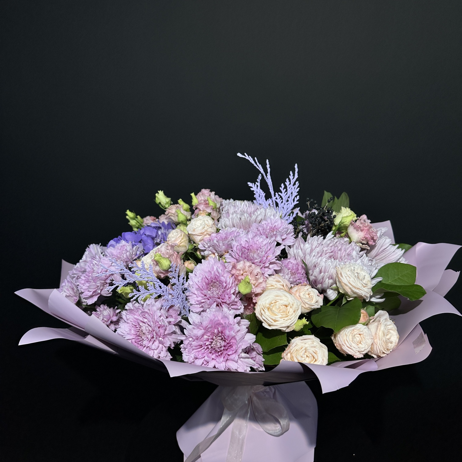 Состав: хризантема кустовая 5, хризантема 3, роза кустовая 3, лизиантус 3, гортензия 1, салал 0,5 и прочее. под заказ