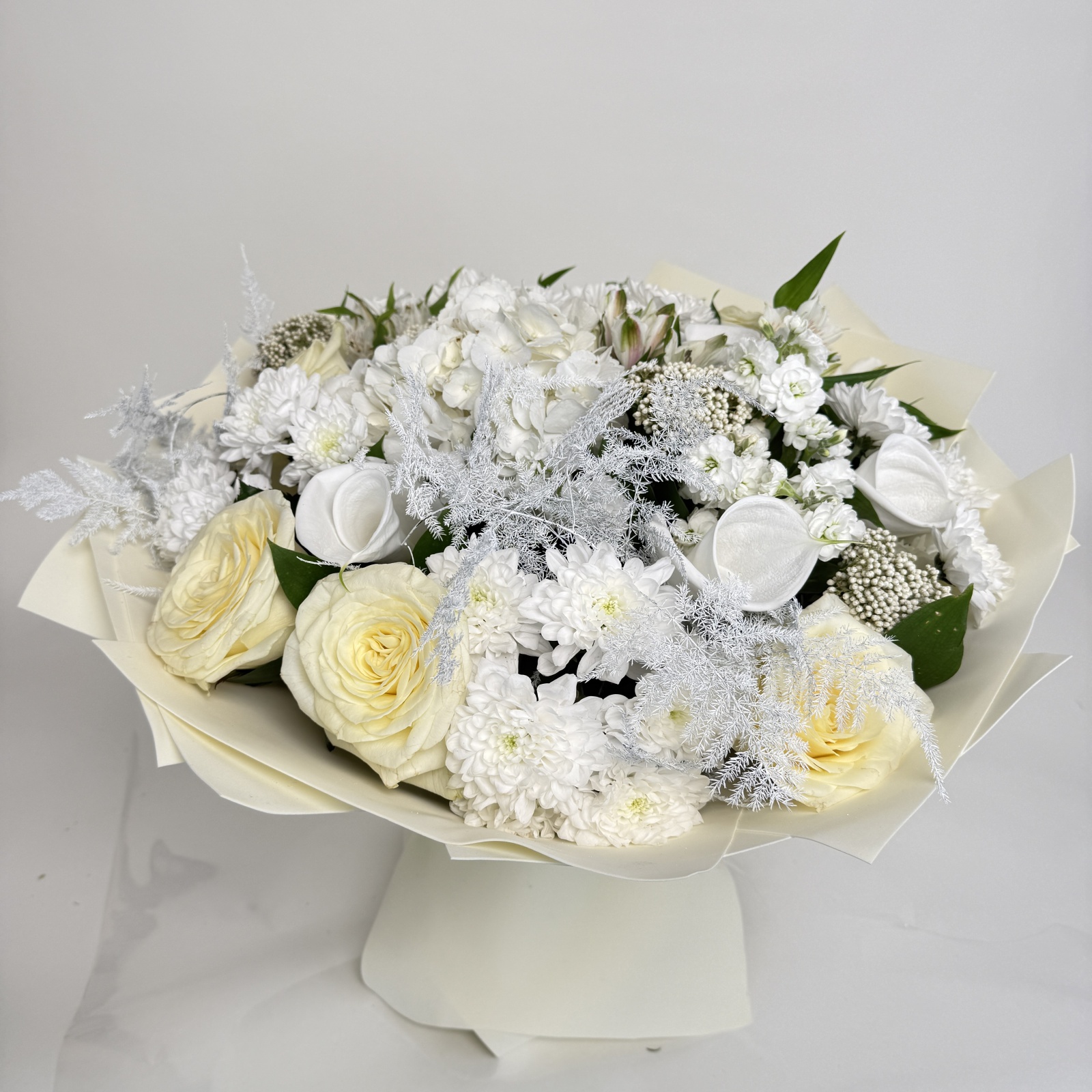 Состав: роза 7, альстромерия 5, хризантема кустовая 5, гортензия 1, маттиола 1, рускус 0,5 и прочее.