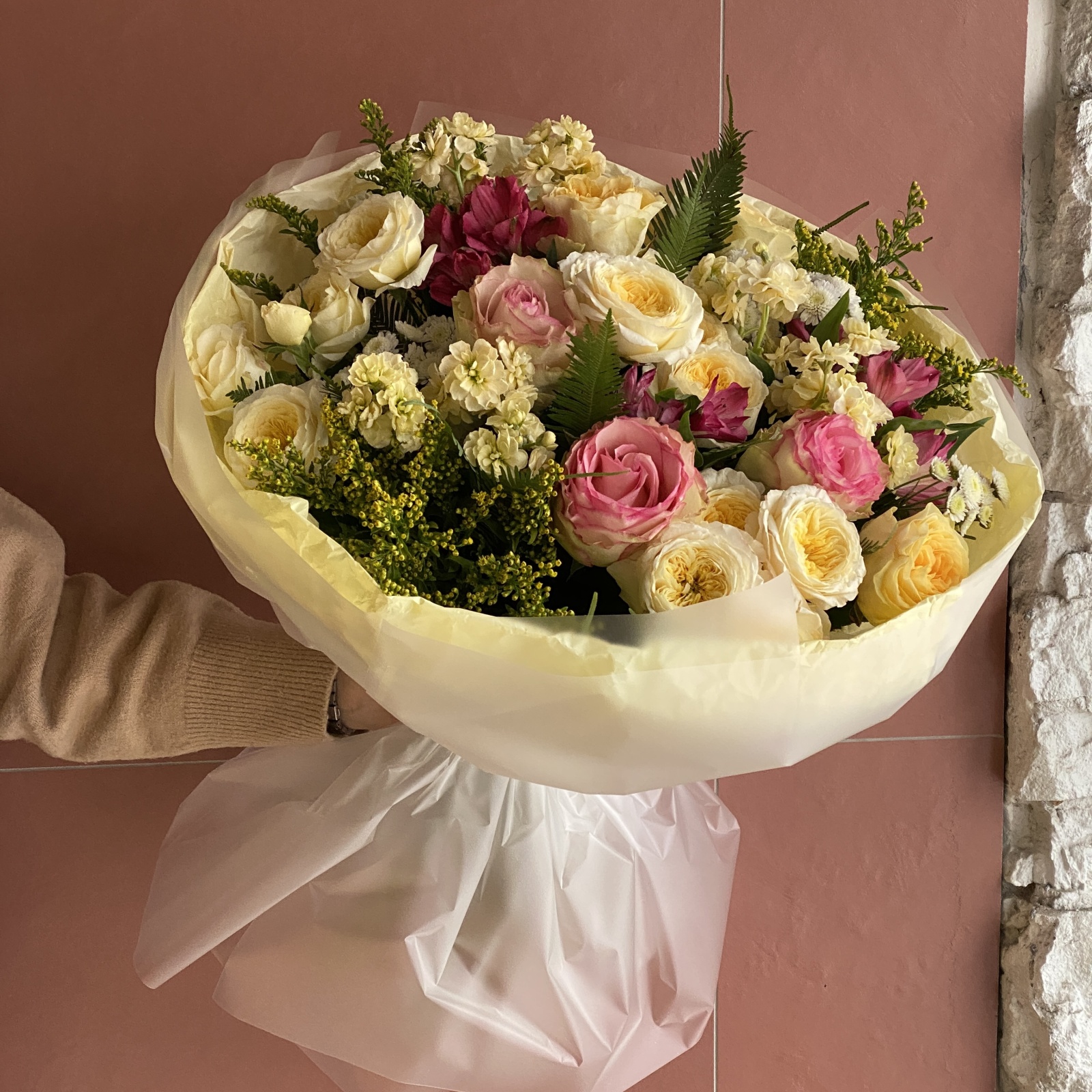 Состав: роза 5, альстромерия 3, роза кустовая 3, хризантема кустовая 3, маттиола 3, солидаго 3, рускус 1 и прочее. под заказ