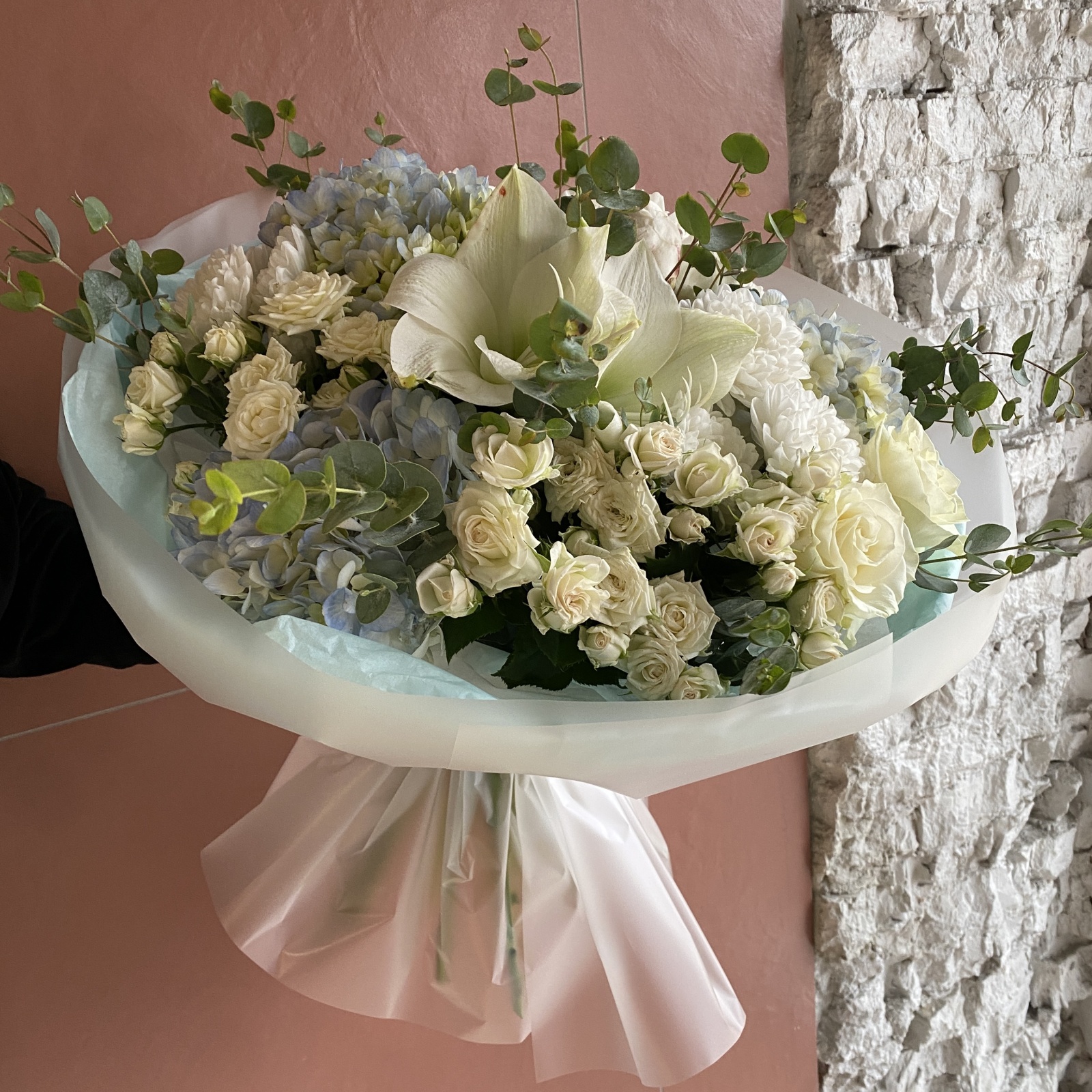 Состав: хризантема кустовая 4, гортензия 3, пион 3, эвкалипт 3, роза 3, роза кустовая 3 и прочее. под заказ