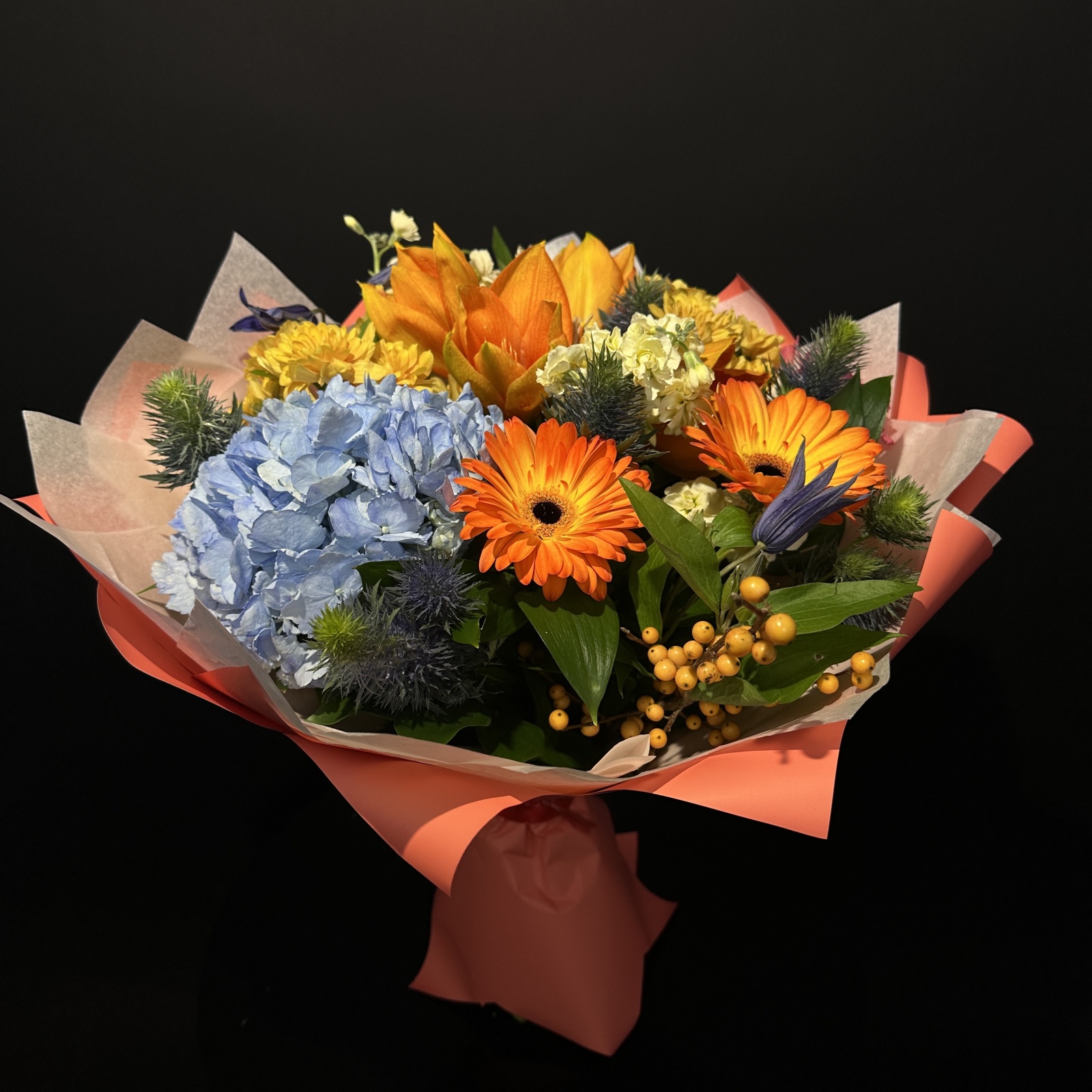 Состав: клематис 3, маттиола 2, роза 2, хризантема кустовая 2, гербера 2, гортензия 1, гиппеаструм 1, эрингиум 1, рускус 0,5 и прочее. в наличии