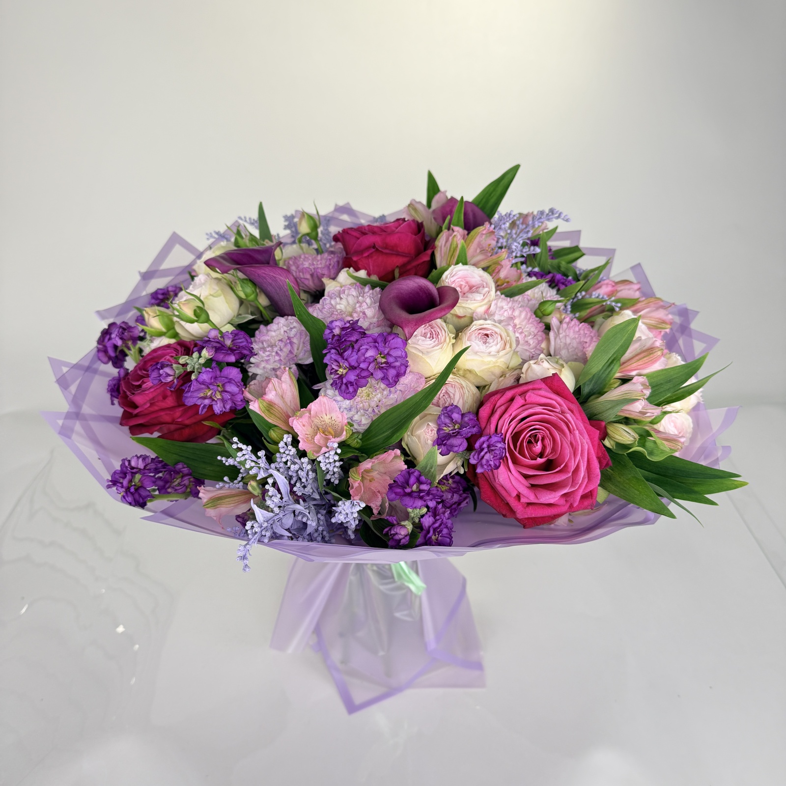 Состав: альстромерия 6, хризантема кустовая 4, маттиола 4, солидаго 3, роза кустовая 3, роза 3 и прочее. в наличии