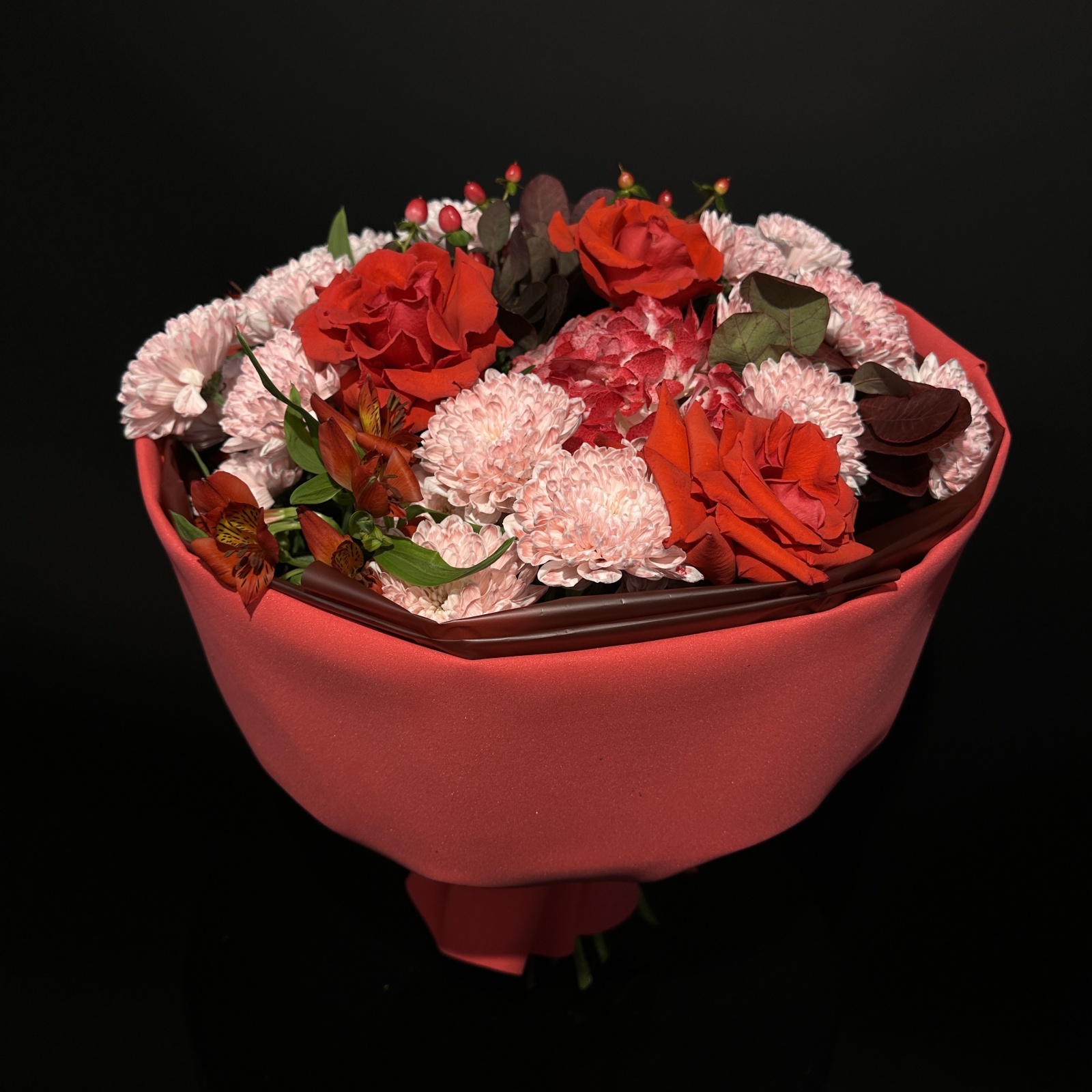 Состав: хризантема кустовая 4, гортензия 2, альстромерия 2, гиперикум 1, фисташка 1, хамелациум 1 и прочее. под заказ
