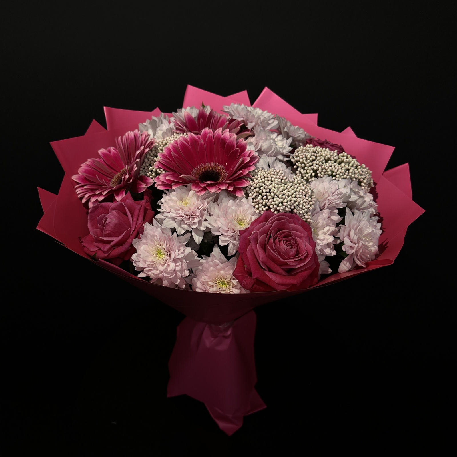 Состав: хризантема кустовая 6, гербера 3, роза 3, рускус 0,5 и прочее.