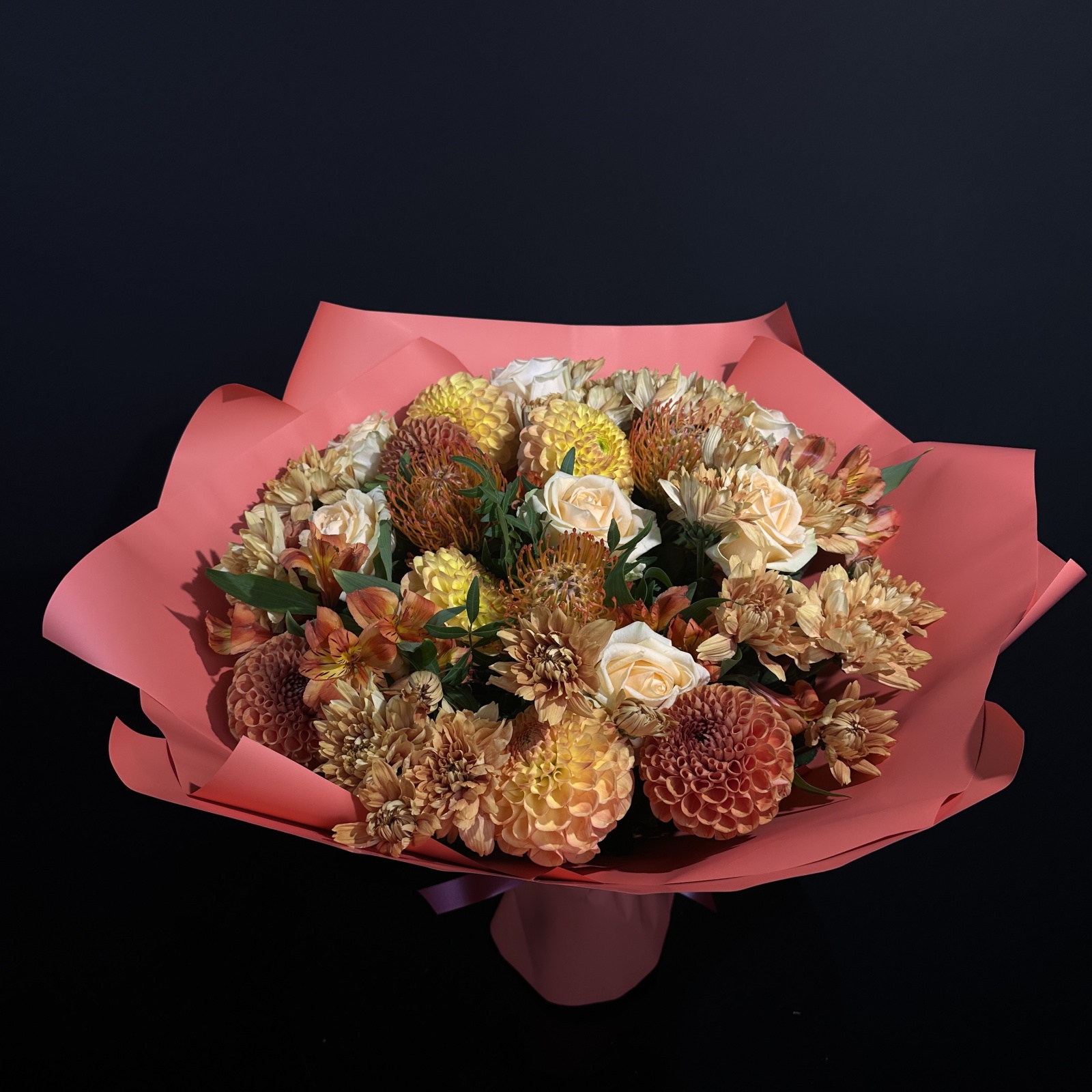 Состав: роза 7, хризантема кустовая 5, альстромерия 4, фисташка 1 и прочее.