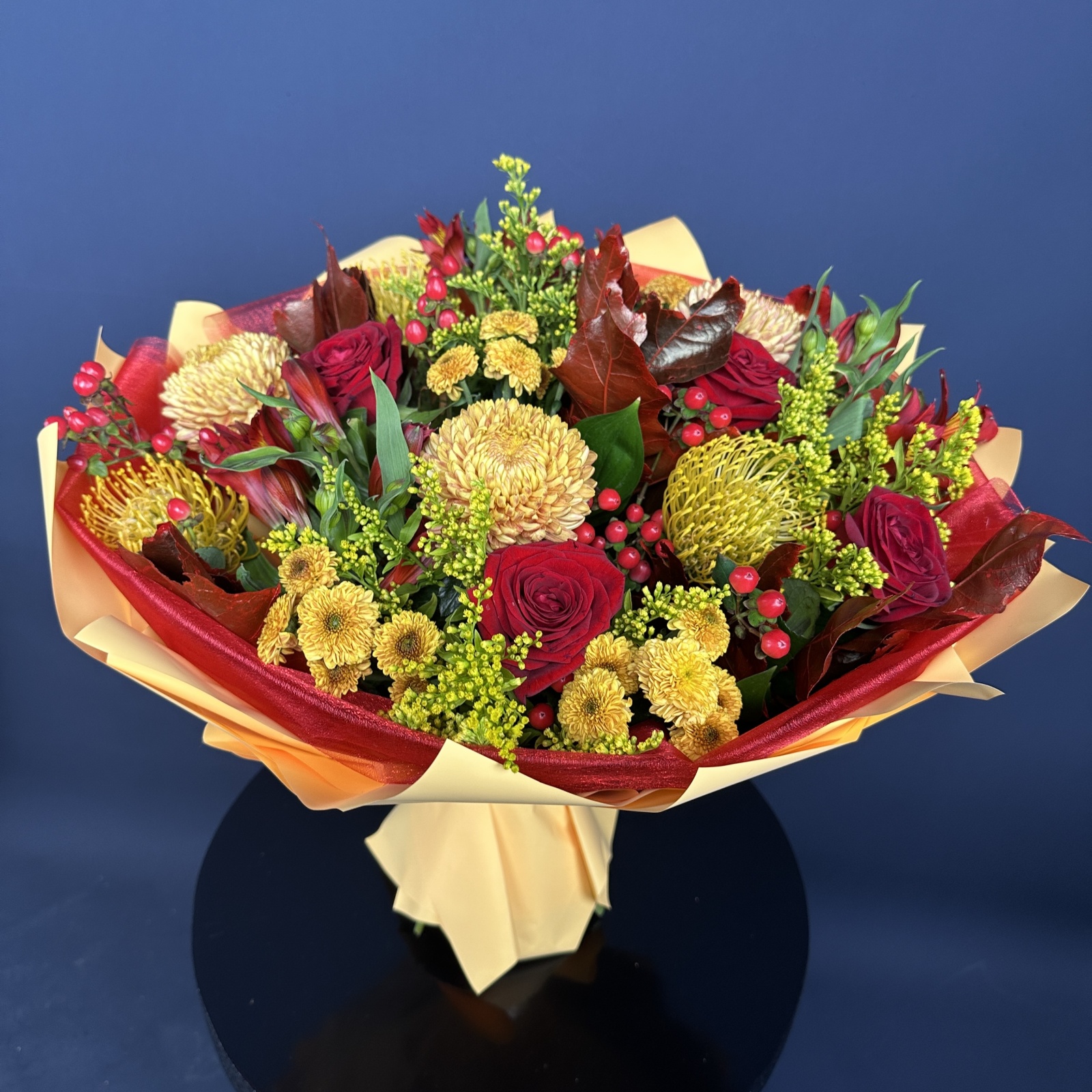 Состав: хризантема 7, роза 5, альстромерия 3, гиперикум 3, солидаго 3 и прочее.
