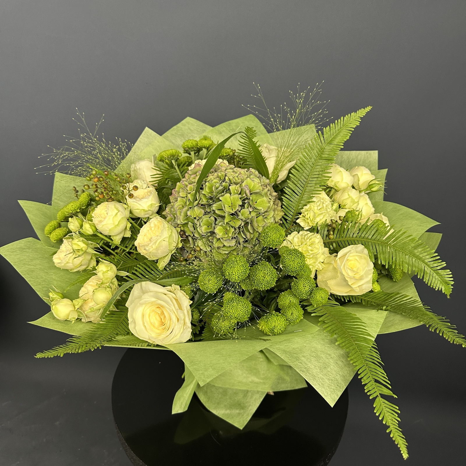 Состав: гвоздика 9, роза 5, хризантема кустовая 4, роза кустовая 2, гортензия 1 и прочее.