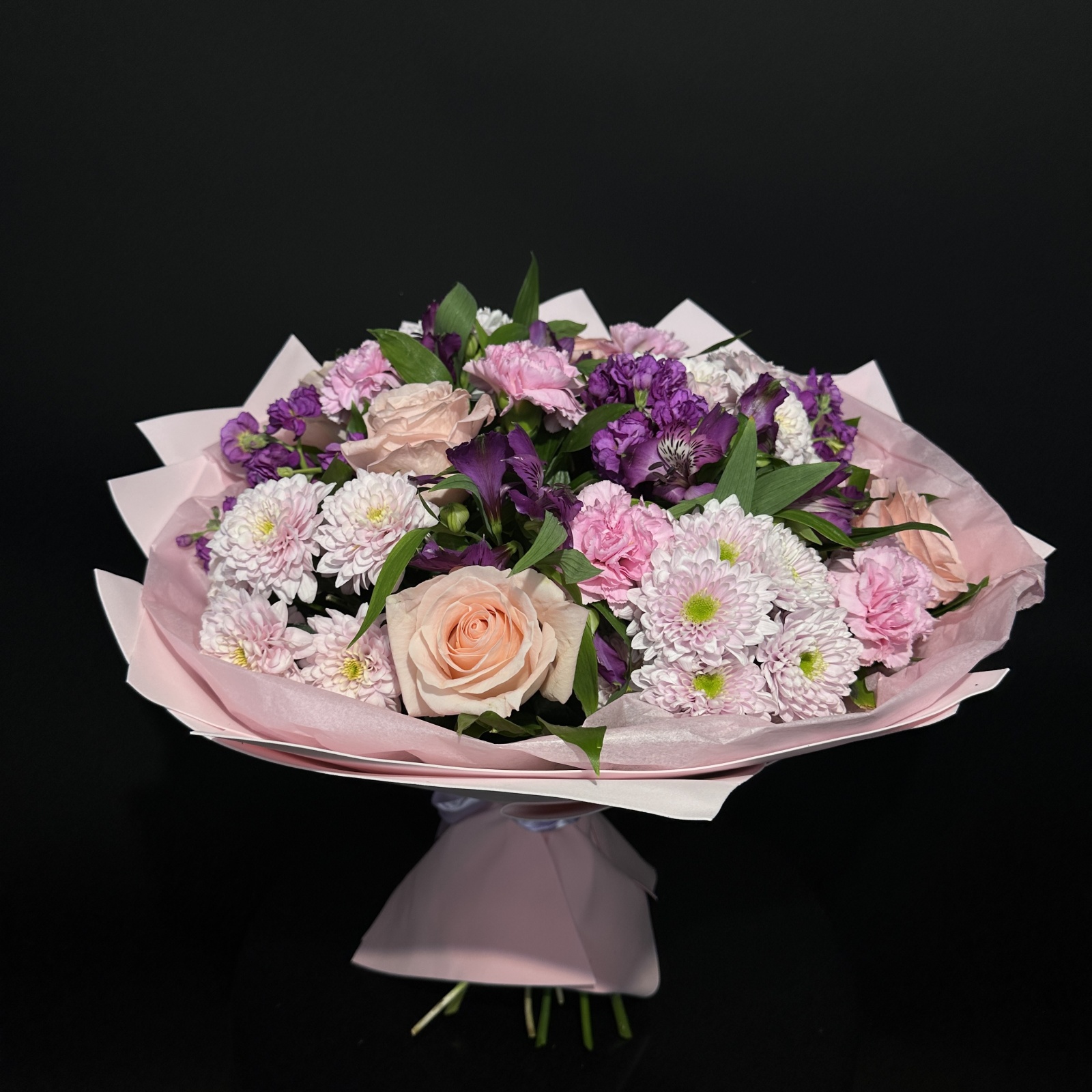 Состав: роза 7, гвоздика 5, хризантема кустовая 4, альстромерия 3, маттиола 3, рускус 0,5 и прочее.