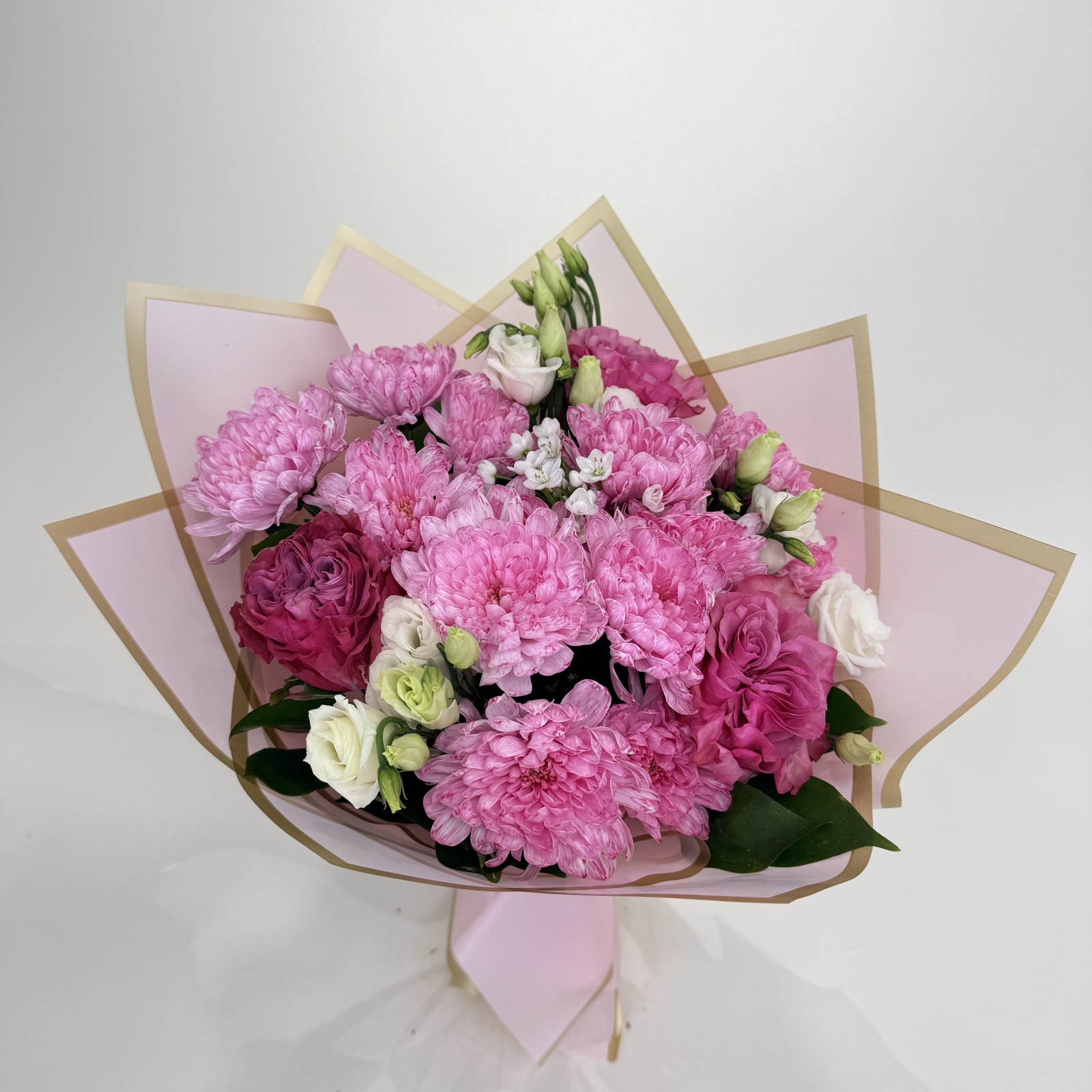 Состав: хризантема кустовая 5, гвоздика 3, лизиантус 2, рускус 0,5 и прочее. в наличии