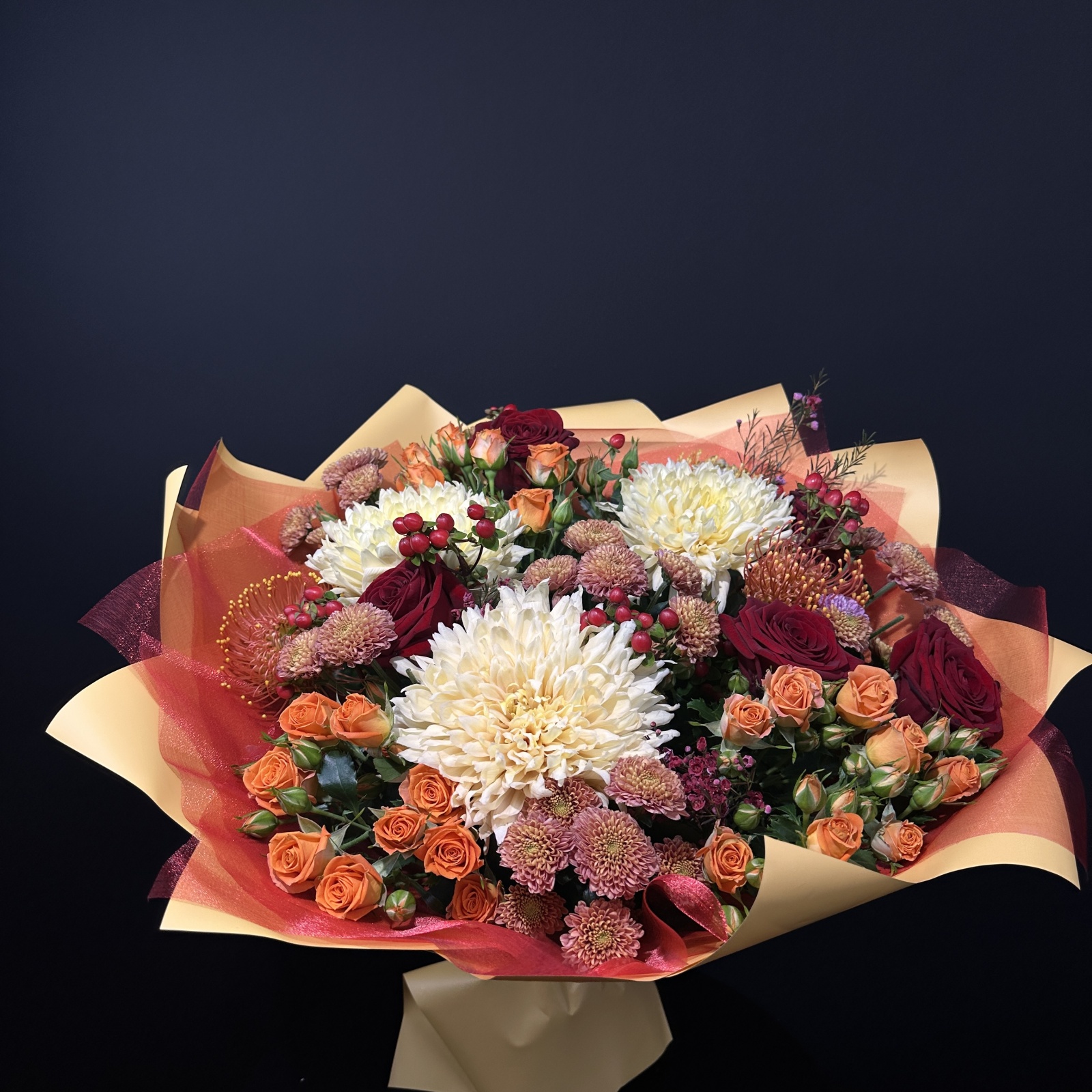 Состав: хризантема 9, роза 5, роза кустовая 3, гиперикум 3, хамелациум 1 и прочее.