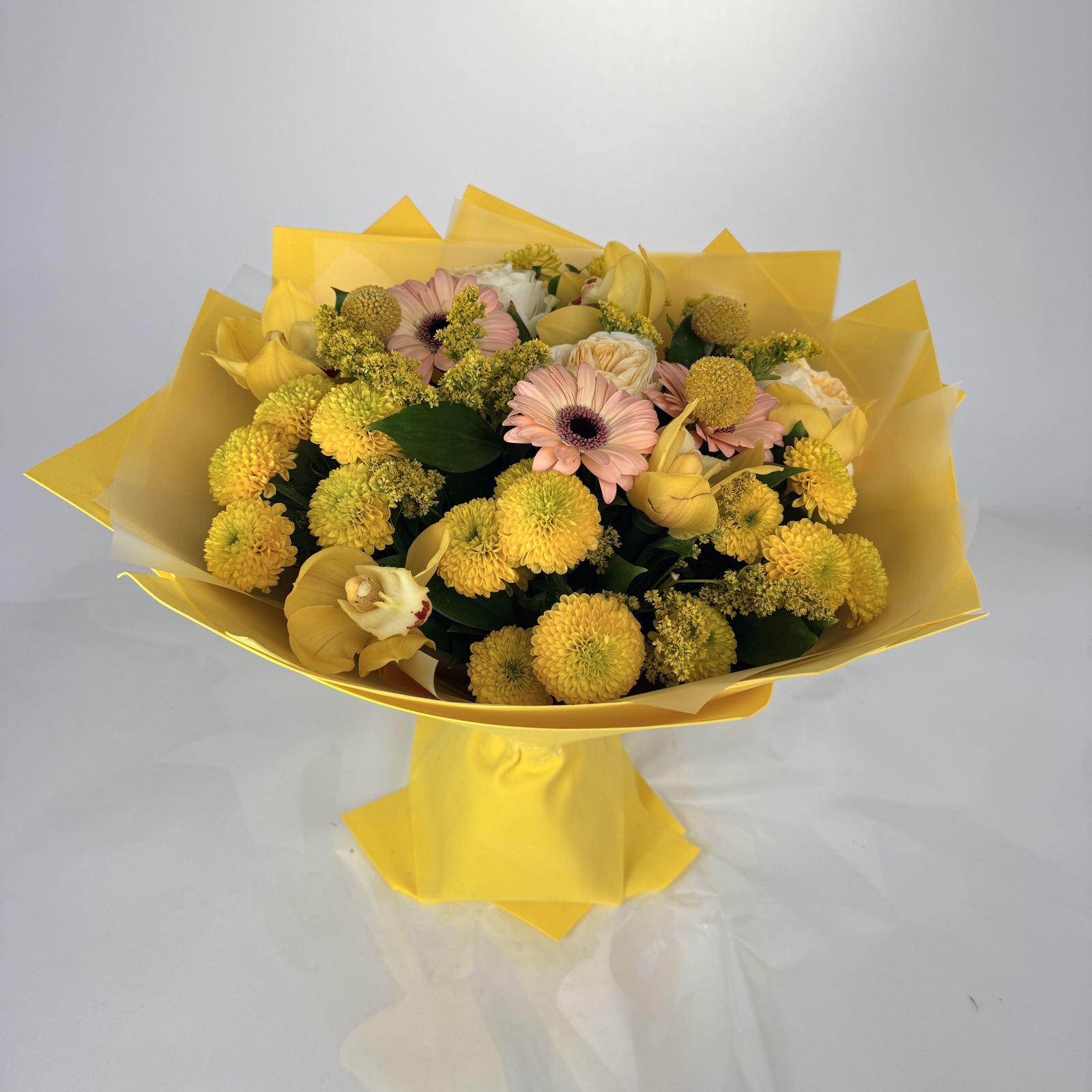 Состав: хризантема кустовая 5, гербера 3, солидаго 3, роза 2, ветка цимбидиум 0,3 и прочее. в наличии
