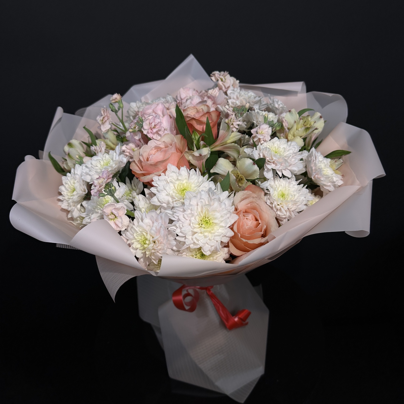 Состав: маттиола 5, хризантема кустовая 4, роза 3, альстромерия 3, гортензия 1, аралия 1 и прочее. под заказ