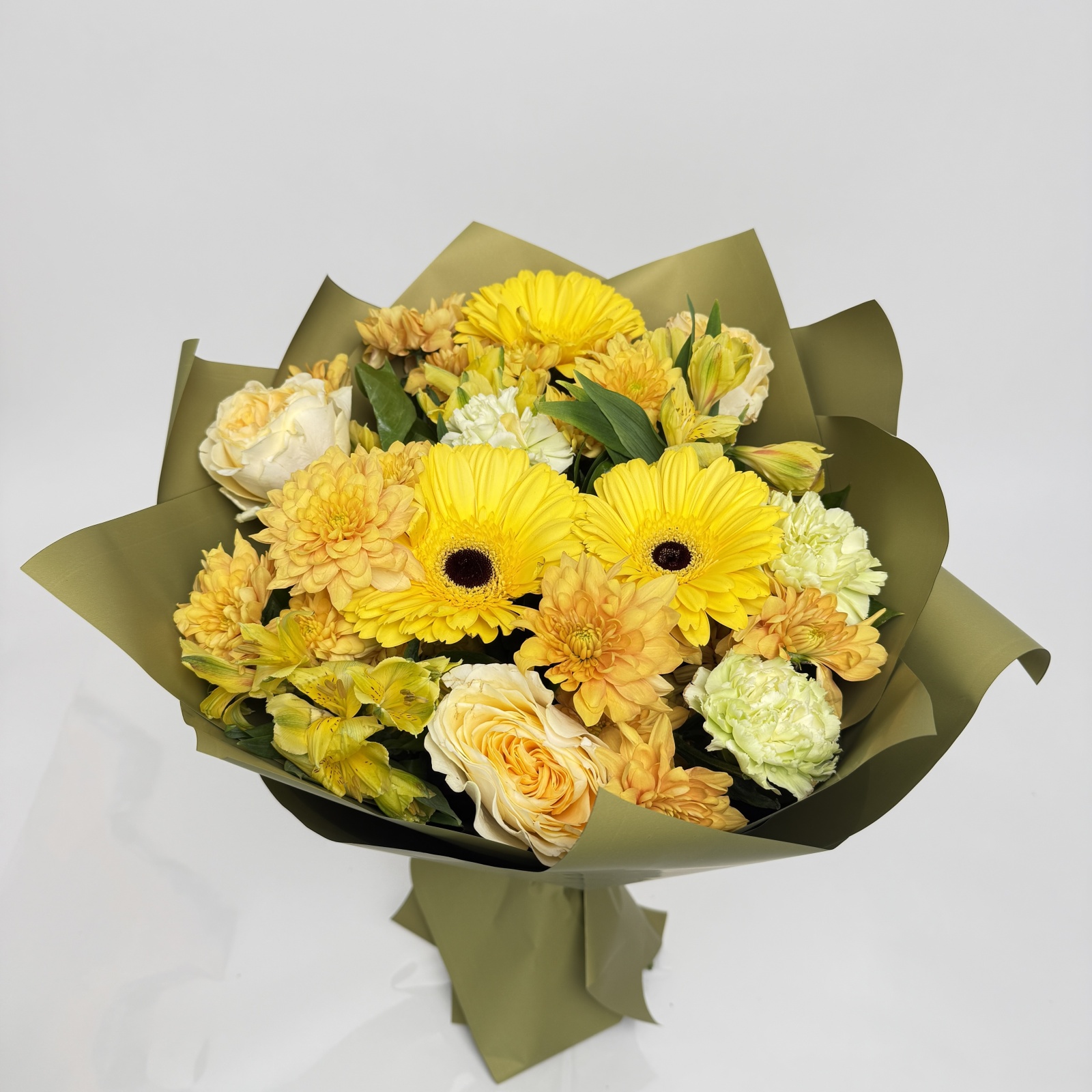 Состав: хризантема кустовая 5, гербера 3, роза 3, альстромерия 3, гвоздика 3 и прочее.