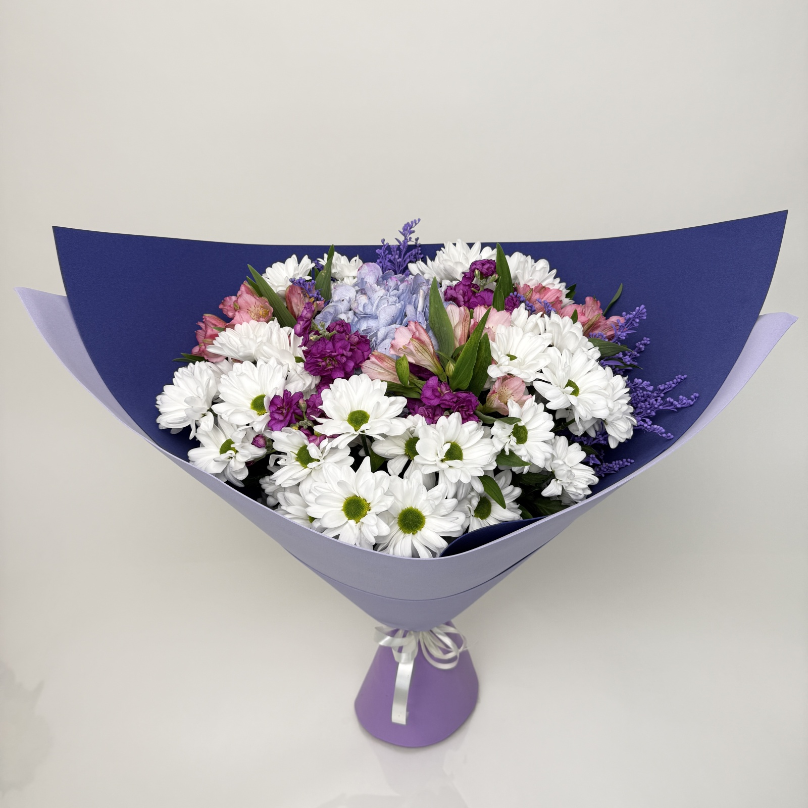 Состав: хризантема кустовая 5, альстромерия 3, маттиола 2, солидаго 2, гортензия 1, роза 1, хризантема 0,5 и прочее.