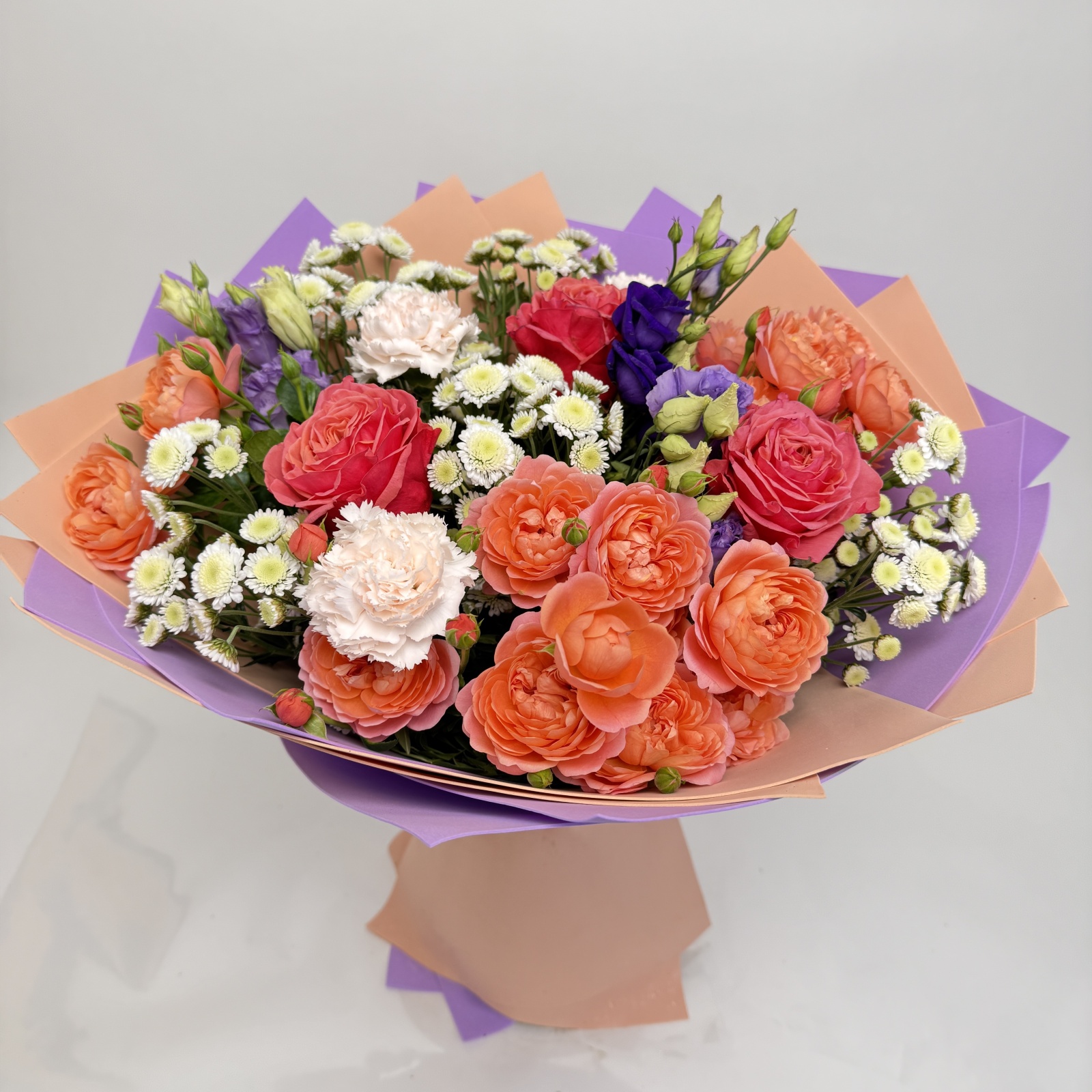 Состав: хризантема кустовая 4, лизиантус 3, роза 3, гвоздика 3, роза кустовая 3, фисташка 1 и прочее. в наличии