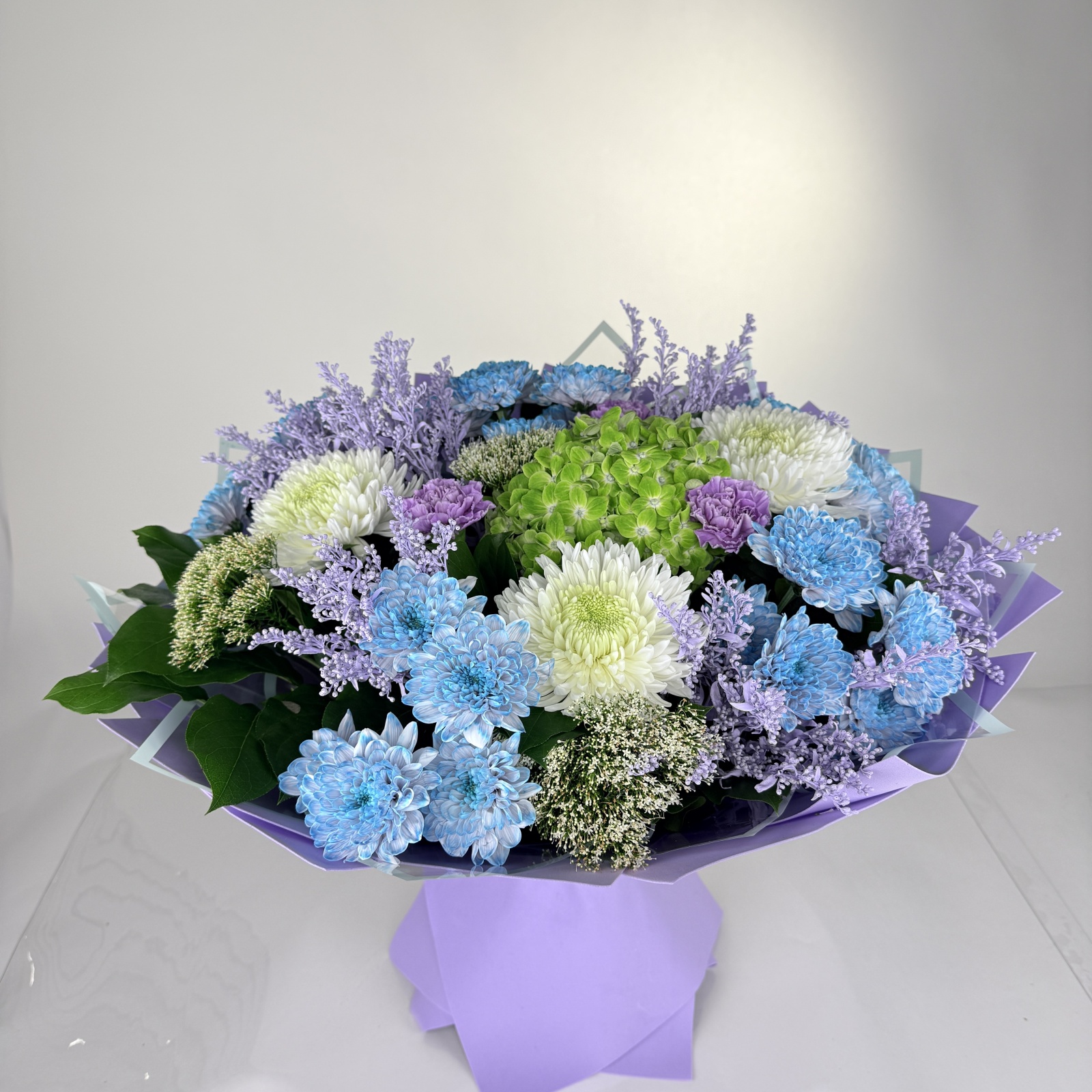 Состав: хризантема кустовая 5, солидаго 5, гвоздика 3, хризантема 3, роза 1, гортензия 1, салал 1 и прочее. в наличии