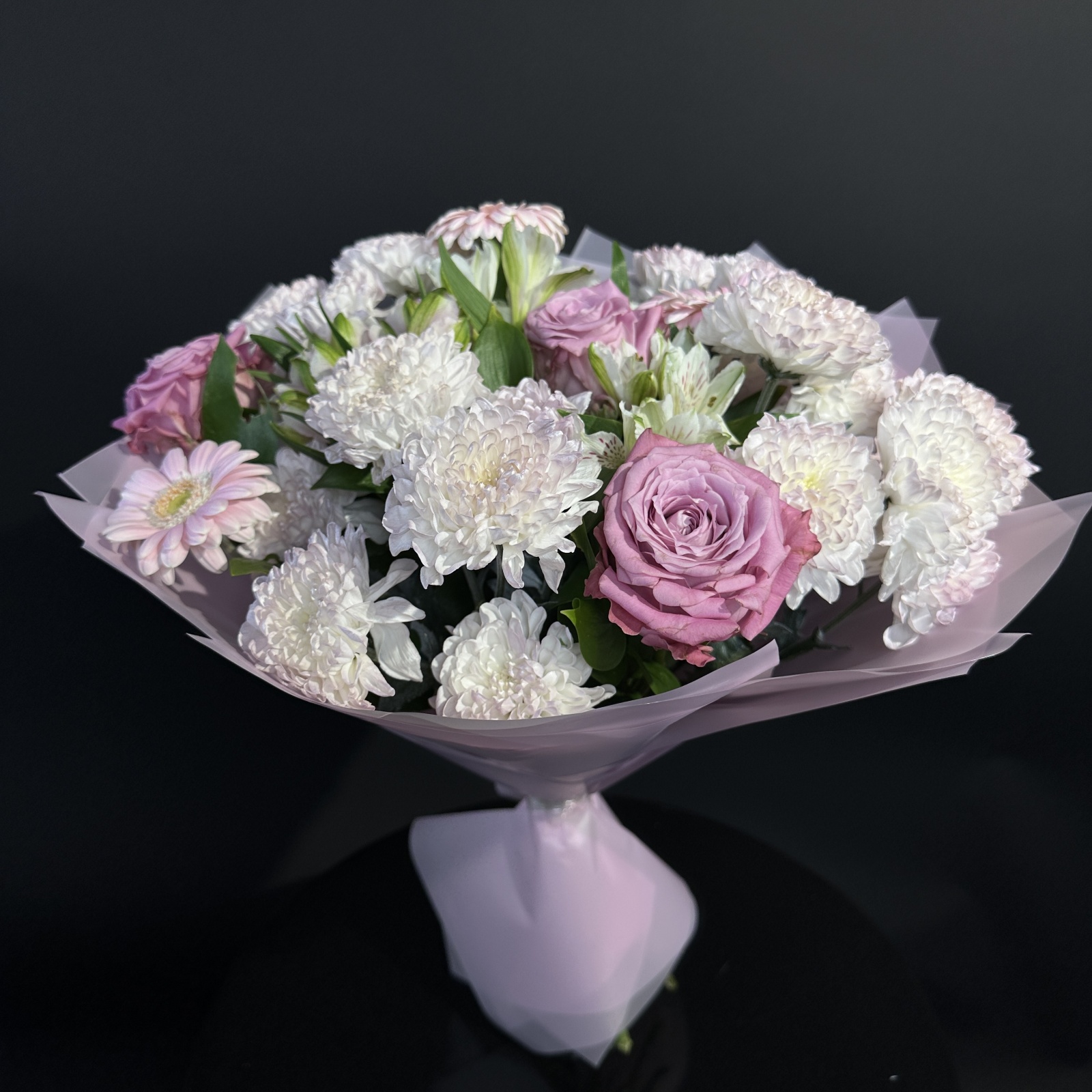Состав: роза 6, хризантема кустовая 5, гербера 3, альстромерия 3, рускус 0,5 и прочее. под заказ