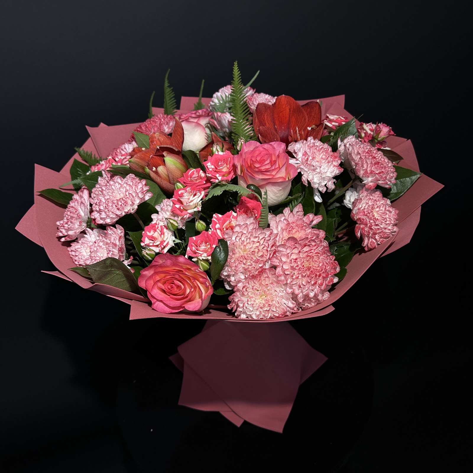Состав: хризантема кустовая 5, роза 3, роза кустовая 3, гиппеаструм 2, салал 0,5 и прочее.