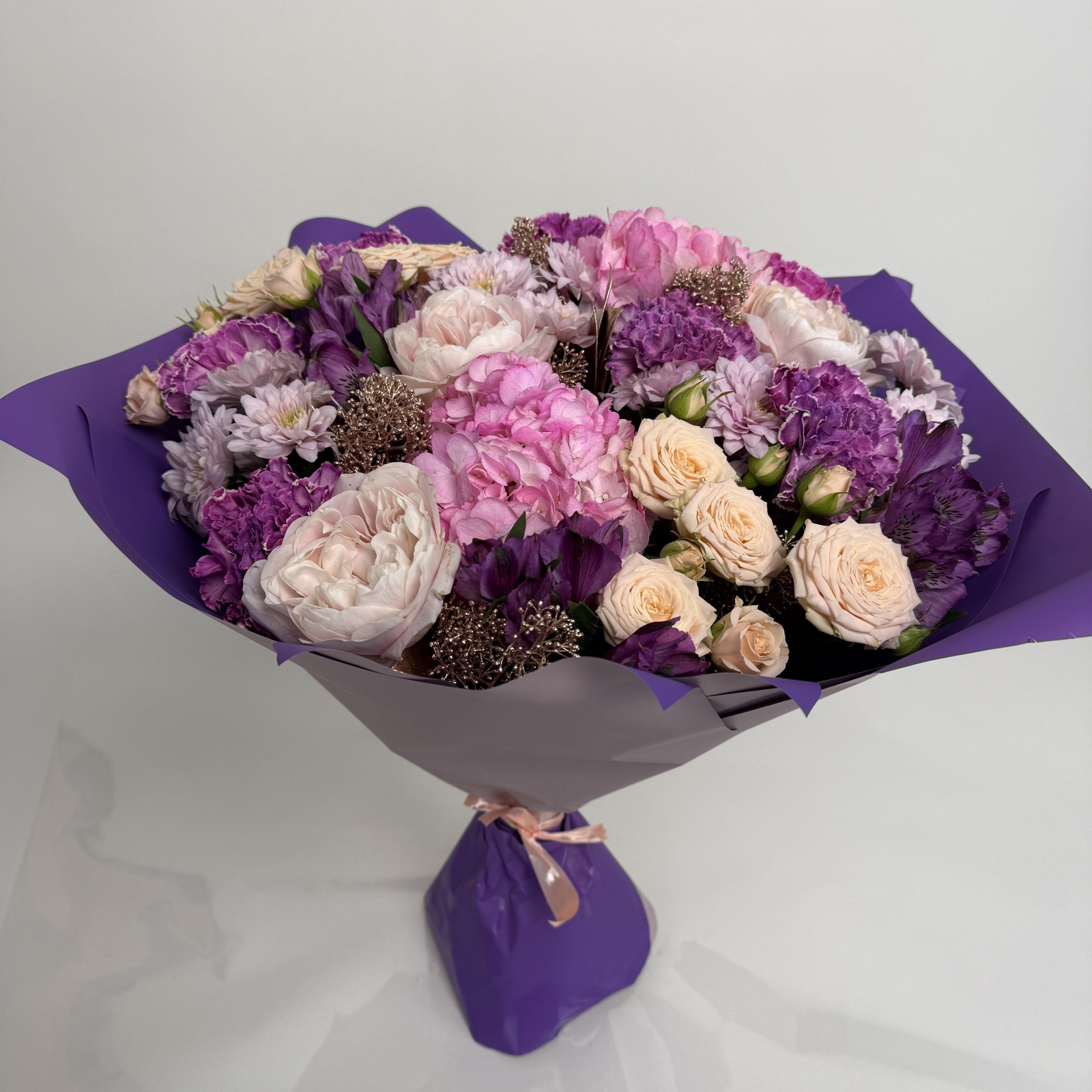 Состав: гвоздика 6, хризантема кустовая 4, роза 3, альстромерия 3, гортензия 2, гиппеаструм 1 и прочее.