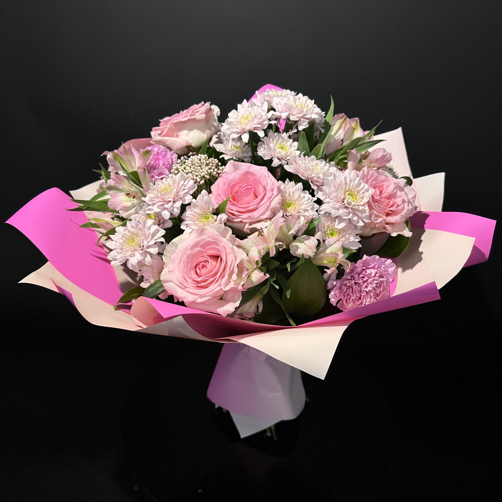 Состав: гвоздика 5, хризантема кустовая 5, роза 5, альстромерия 3, рускус 1 и прочее. в наличии