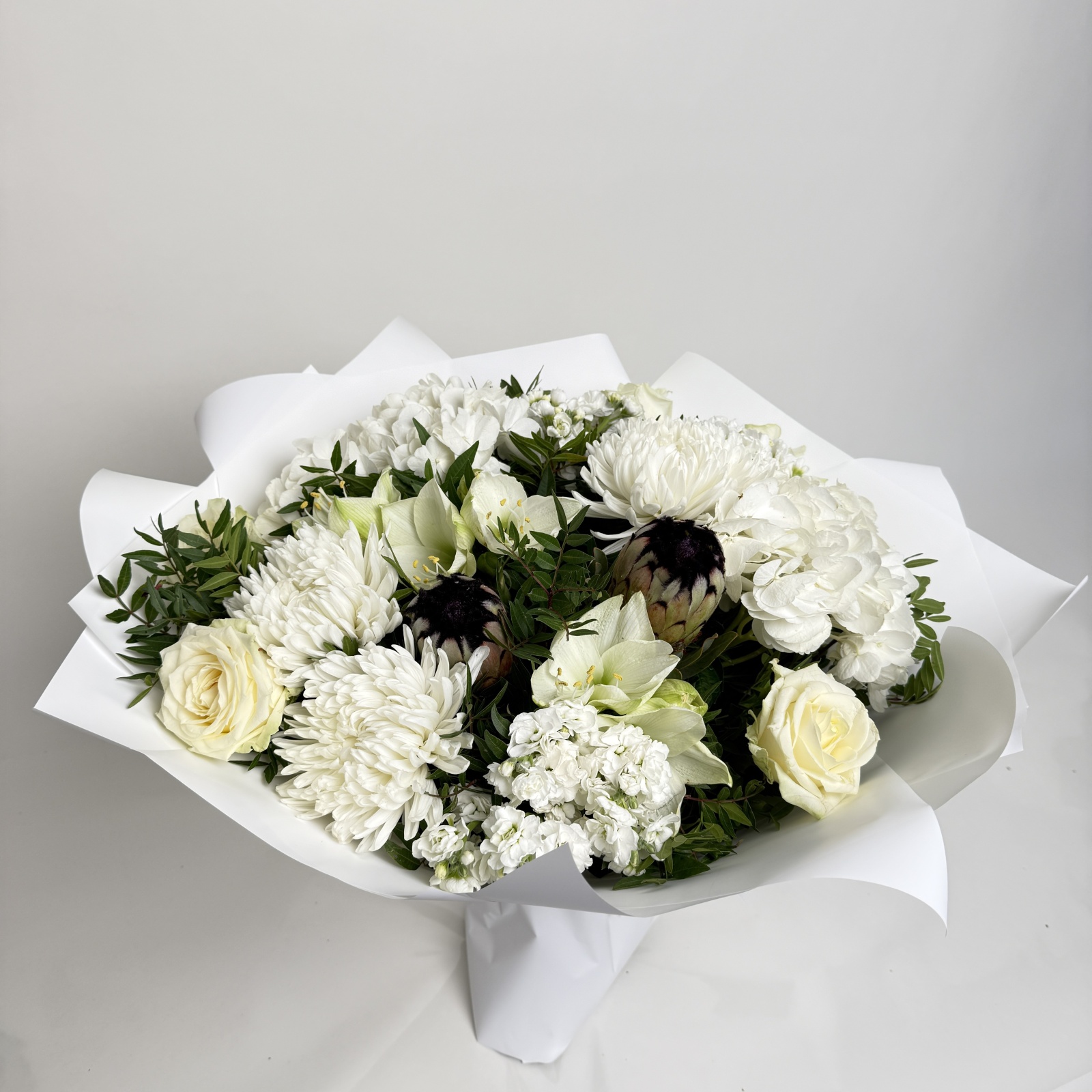 Состав: роза 4, маттиола 3, хризантема 3, гортензия 2, фисташка 1 и прочее. под заказ